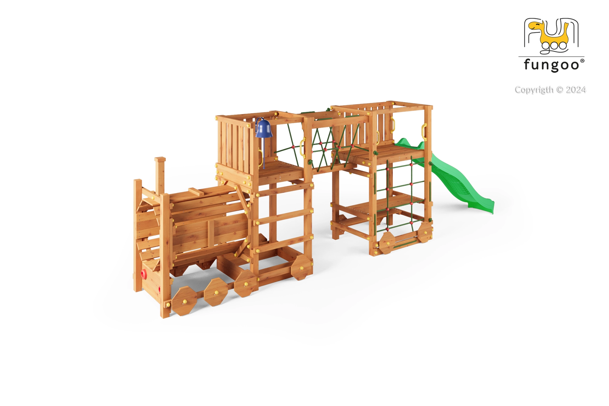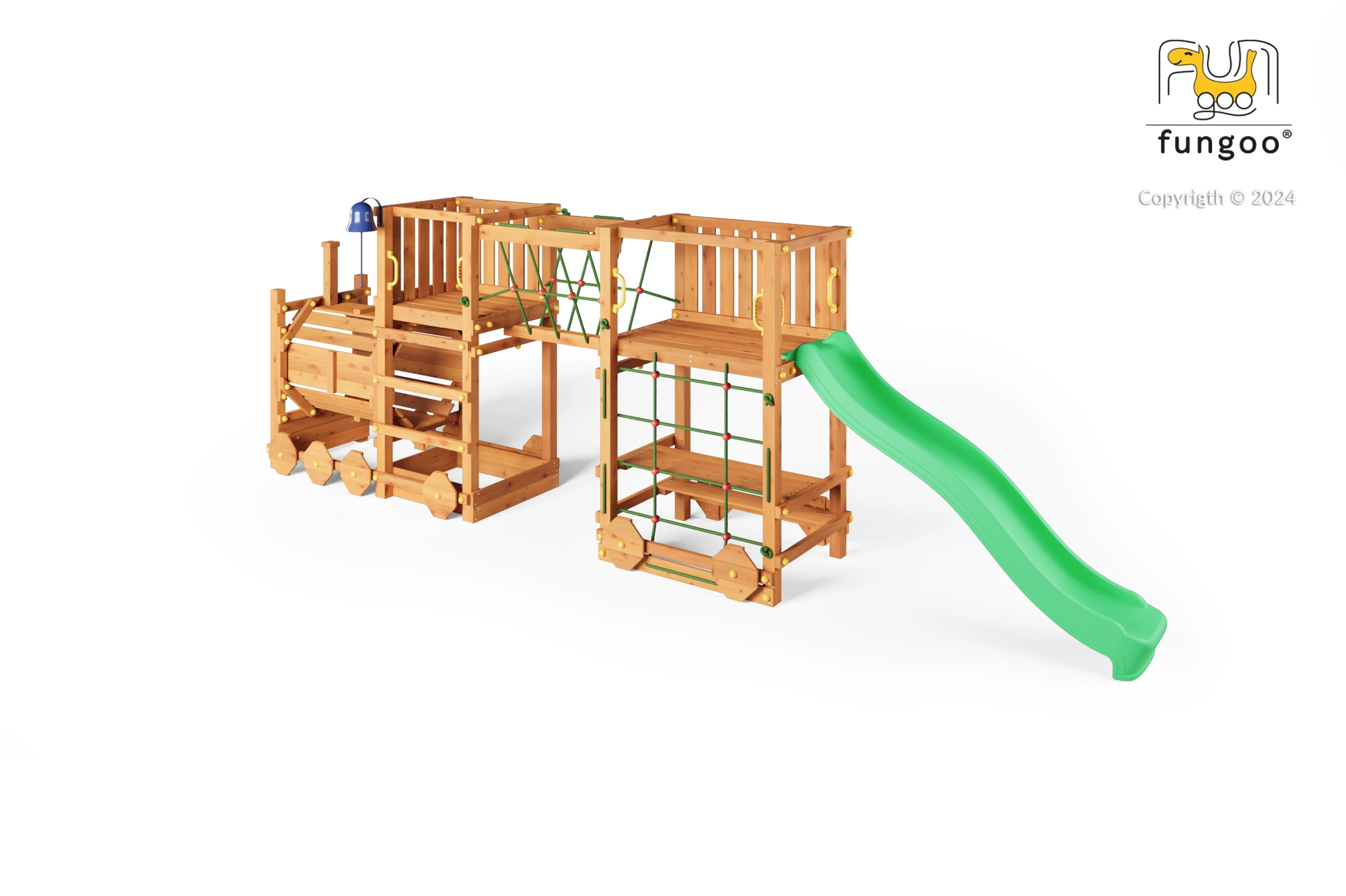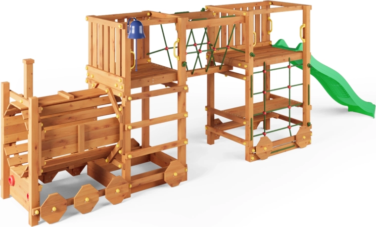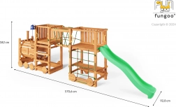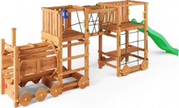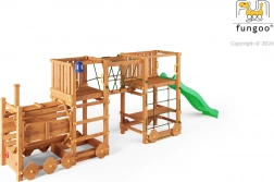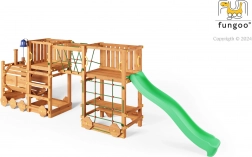 Plac zabaw FUNGOO Loco Express łączy bezpieczną drewnianą konstrukcję z magnetycznym motywem kolejowym, który pobudza wyobraźnię. Dzieci mogą się wspinać, zjeżdżać, przechodzić przez tunel lokomotywy i odpoczywać przy stoliku piknikowym pod platformą. Dzięki wysokiej jakości drewnu z impregnacją zestaw jest stabilny, trwały i idealny do całodziennej zabawy na świeżym powietrzu.
