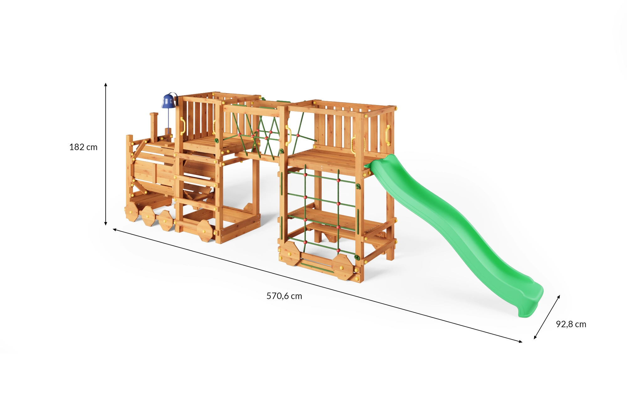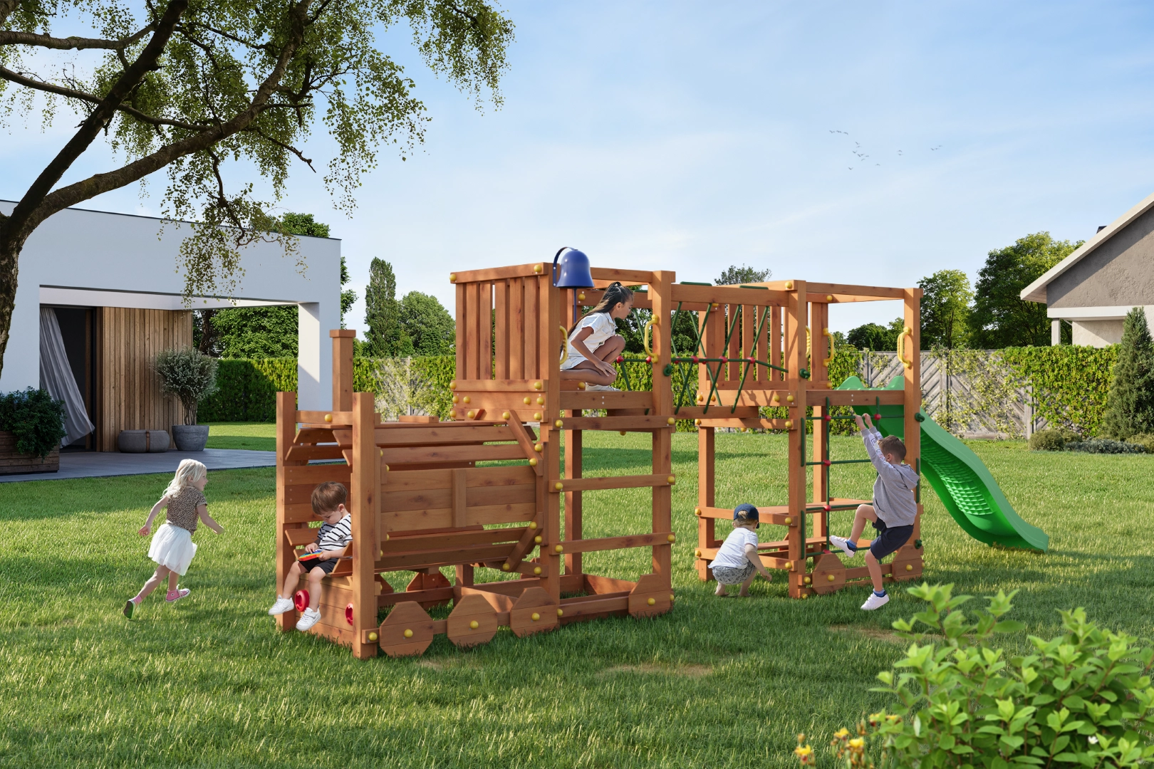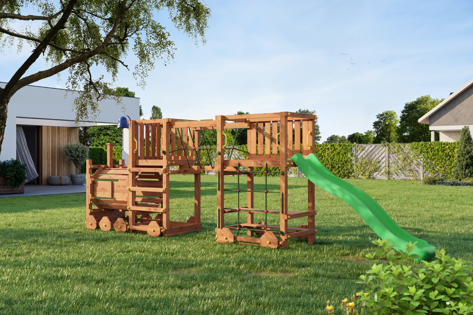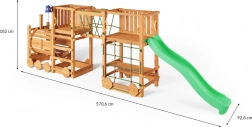 Przemyślane wyposażenie poprawia zwinność, równowagę i koordynację. Most linowy i siatka wspinaczkowa rozwijają motorykę, zjeżdżalnia 2,2 m zapewnia szybką zabawę, a uchwyty i kotwy gruntowe gwarantują pewność podczas użytkowania. Plac jest przeznaczony do prywatnych ogrodów dla dzieci od 3 lat i do wagi 50 kg na użytkownika.
