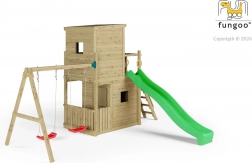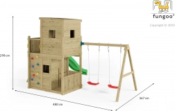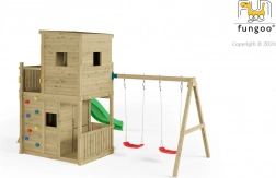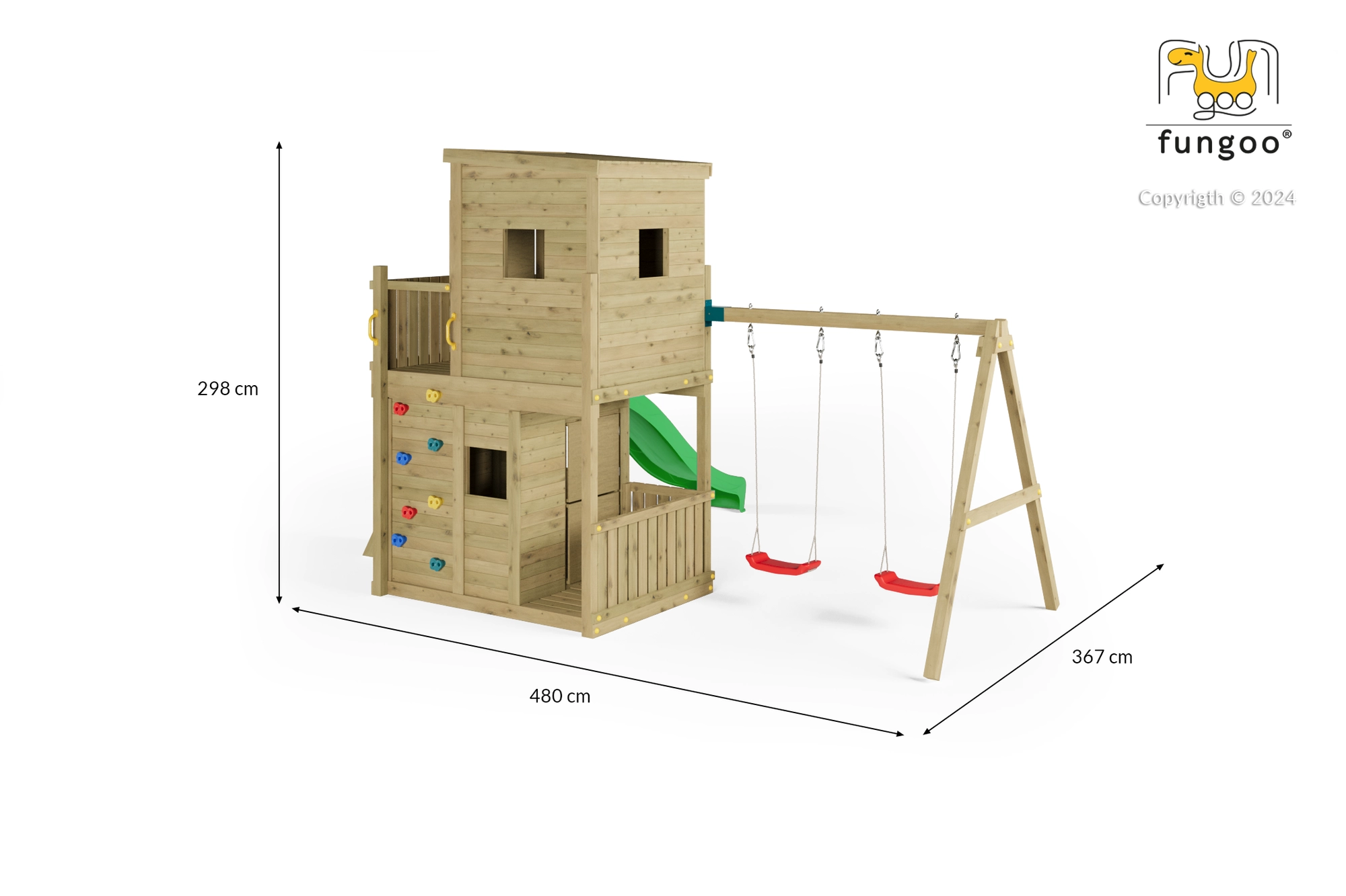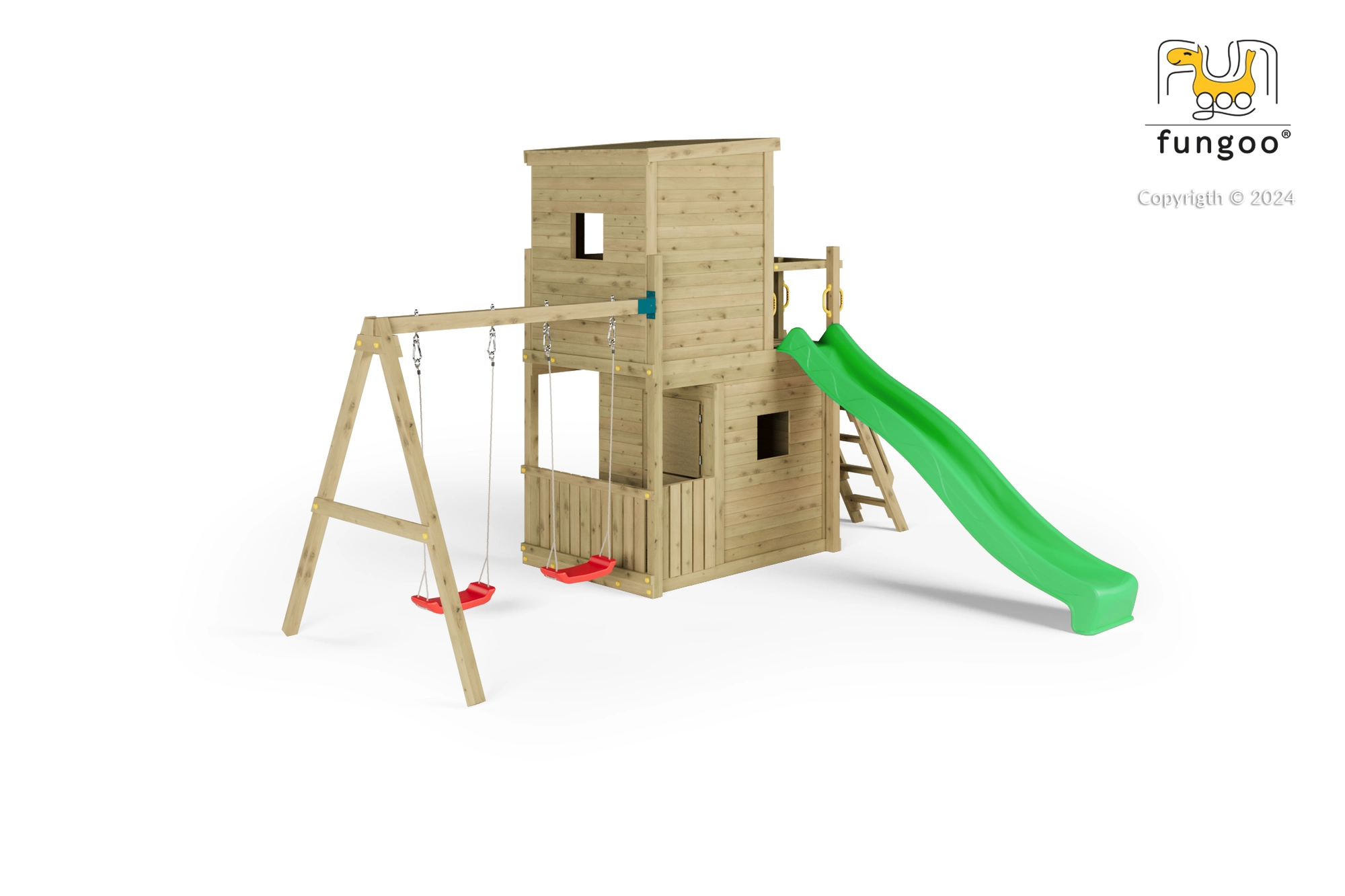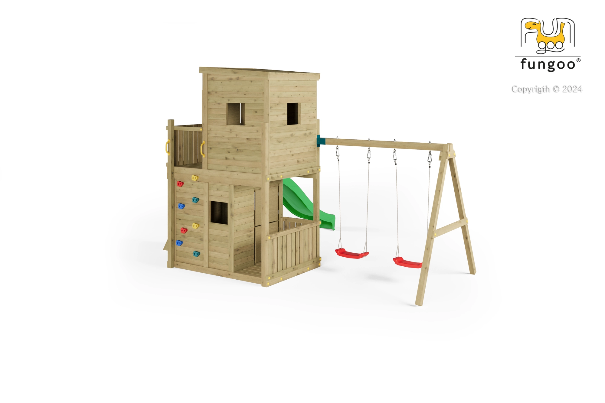 Plac zabaw FUNGOO Lofter łączy stabilną drewnianą konstrukcję z bogatym wyposażeniem dla wszechstronnej zabawy: wysoki domek z dachem i drzwiczkami, pofałdowaną zjeżdżalnię 2,9 m, ściankę wspinaczkową z chwytami, wygodne wejście po schodkach oraz ramę z dwiema huśtawkami. Dzięki wysokiej jakości łączeniom, poręczom bezpieczeństwa i elementom kotwiącym całość jest solidnie zakotwiona i gotowa na codzienne użytkowanie.