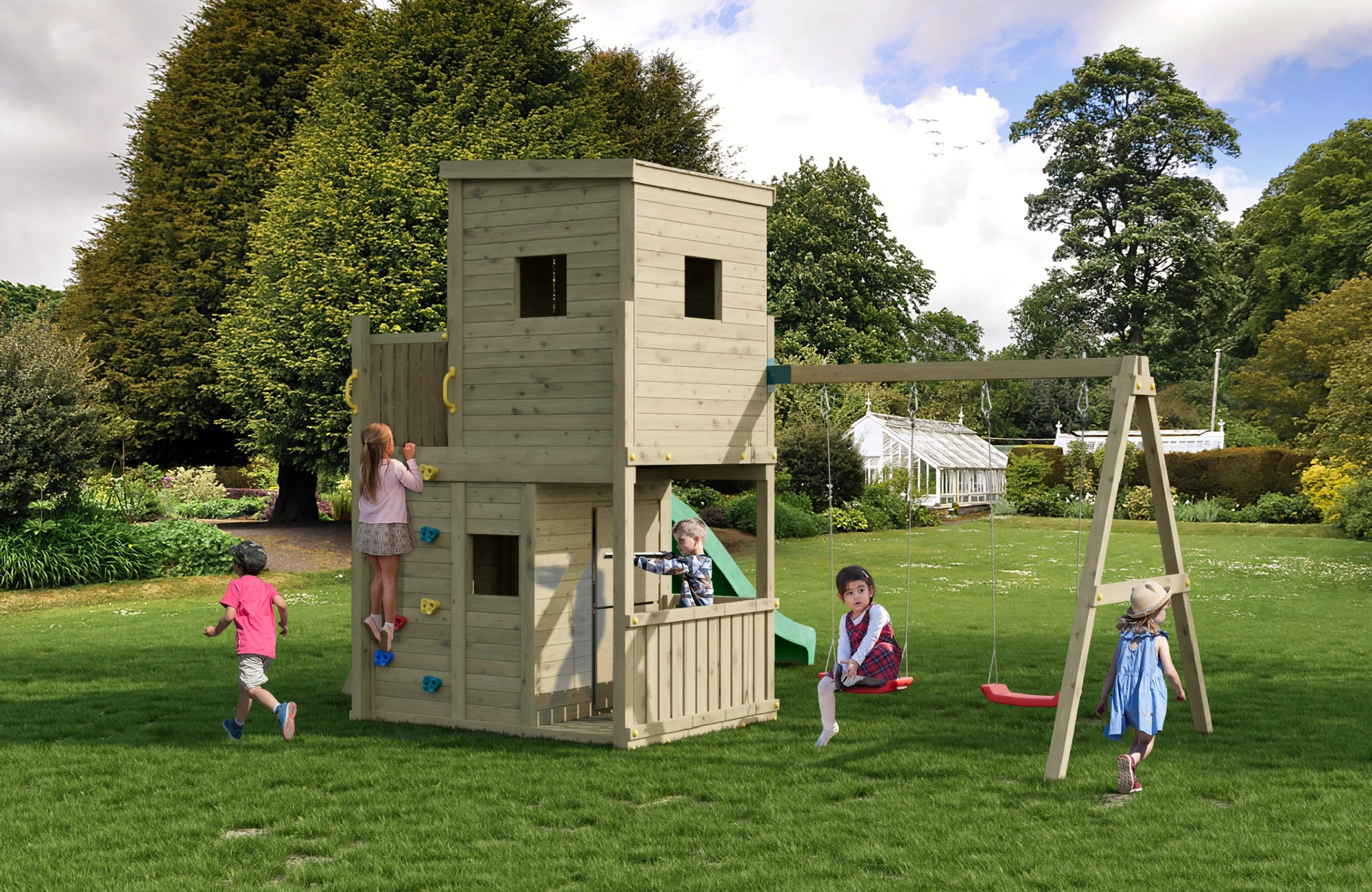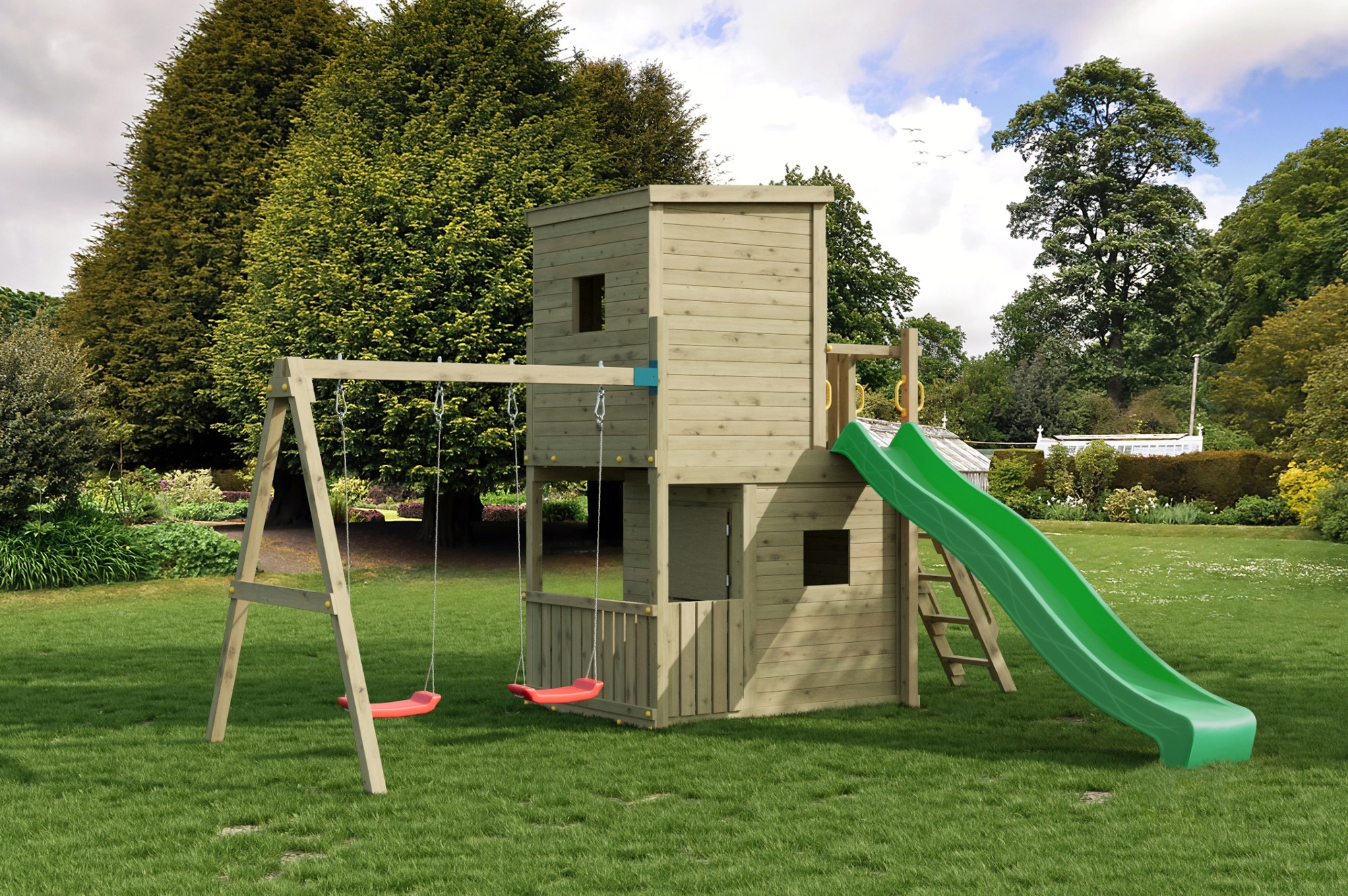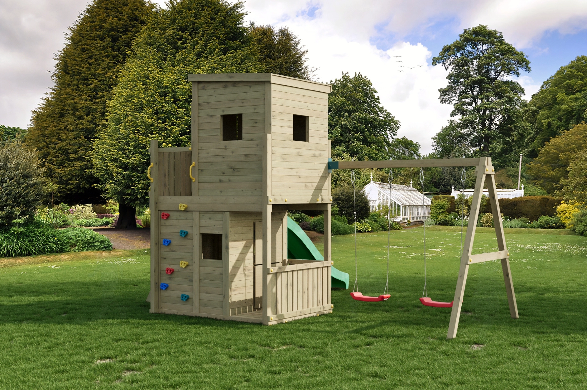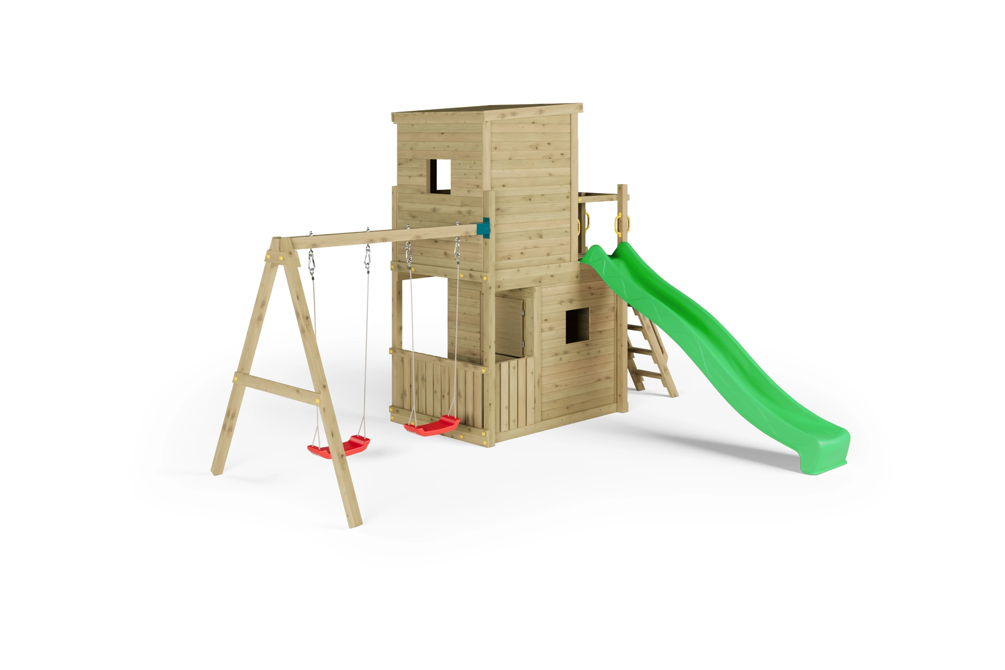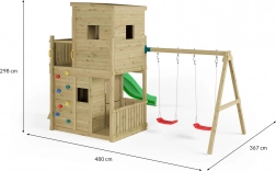 - Kompleksowa zabawa: zjeżdżanie, wspinanie, huśtanie oraz zabawa w domku