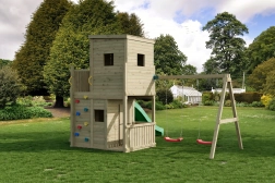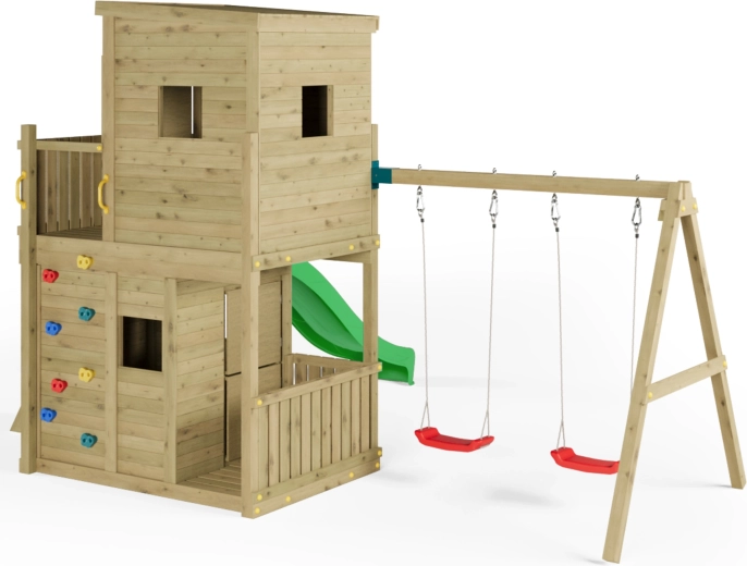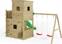 Kolorowe chwyty wspinaczkowe rozwijają siłę i koordynację, dwie regulowane huśtawki na solidnych linach umożliwiają zabawę indywidualną i wspólną.