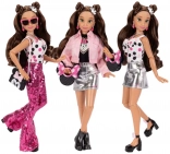 W zestawie znajdują się błyszczące różowe spodnie, top w grochy, srebrna spódnica, czarny top, różowa kurtka, buty, torebki i okulary – nieskończone kombinacje wyglądów.