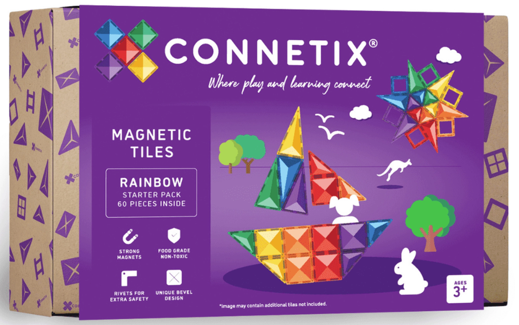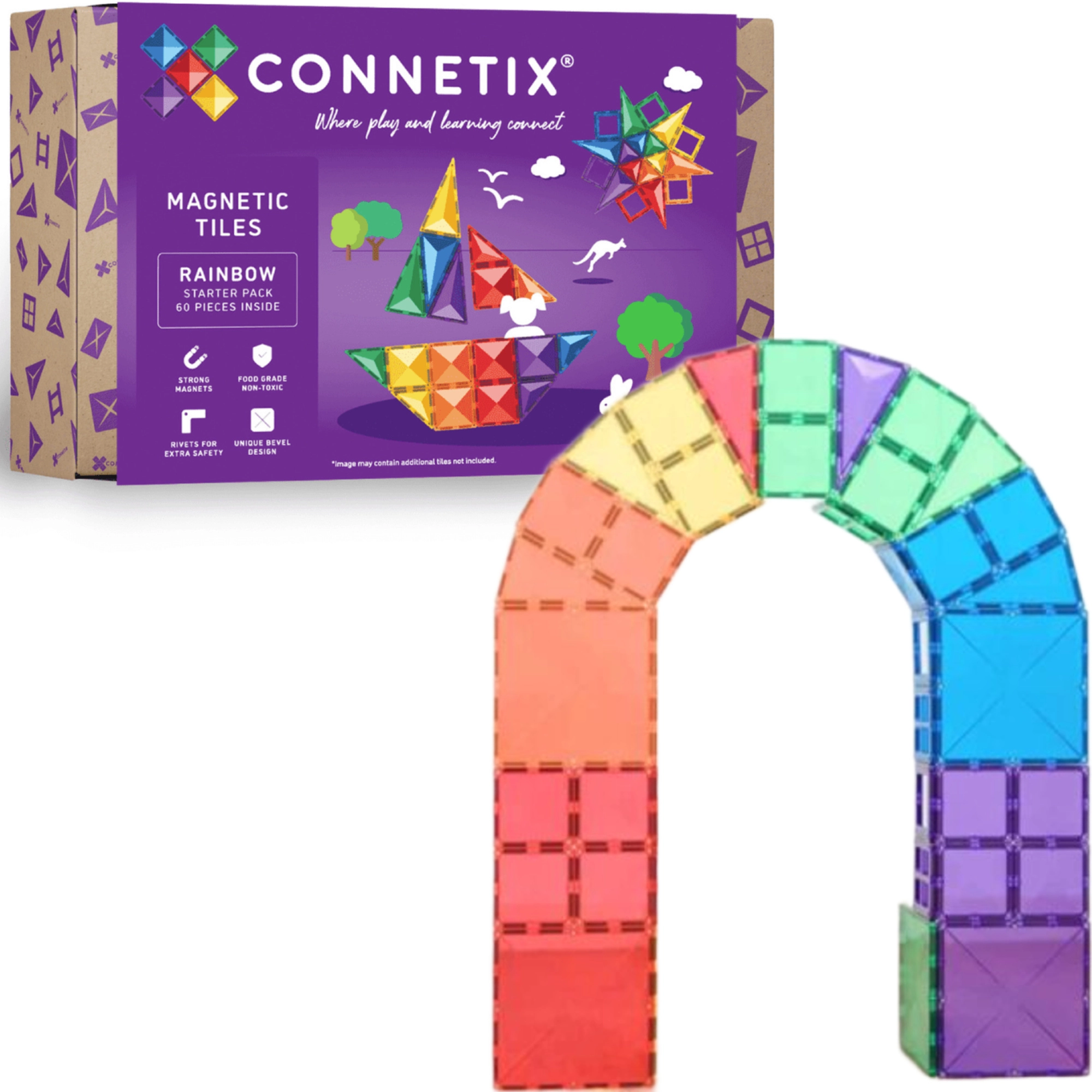 Zestaw startowy CONNETIX Rainbow Starter Pack oferuje 60 wysokiej jakości, półprzezroczystych magnetycznych płytek w intensywnych kolorach, z zaokrąglonymi krawędziami i bardzo silnymi magnesami neodymowymi dla stabilnych konstrukcji. Dzieci pokochają charakterystyczne „kliknięcie” przy łączeniu, a jednocześnie naturalnie rozwijają matematykę, fizykę, technikę i sztukę.
