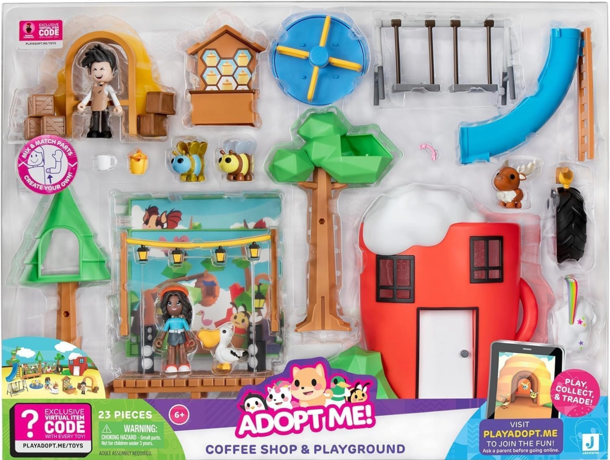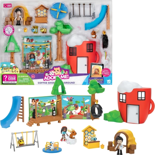 Odkryj dwa kultowe miejsca z wyspy ADOPT ME! w jednym zestawie – przytulną kawiarnię i kolorowy plac zabaw. Dzieci mogą przygotowywać napoje za ladą, sadzać gości przy stolikach, a potem szaleć na zjeżdżalni, huśtawkach czy karuzeli. Dzięki modułowym elementom sceny można łatwo przebudowywać i tworzyć nowe historie.