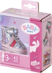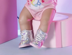 BABY born Holograficzne sportowe buty są idealnym dodatkiem dla każdej małej stylistki. Te stylowe srebrne buty z różowymi paskami i rzepami gwarantują łatwe wkładanie i doskonale uzupełniają każdą modną stylizację dla lalek.