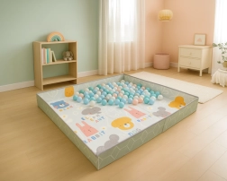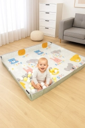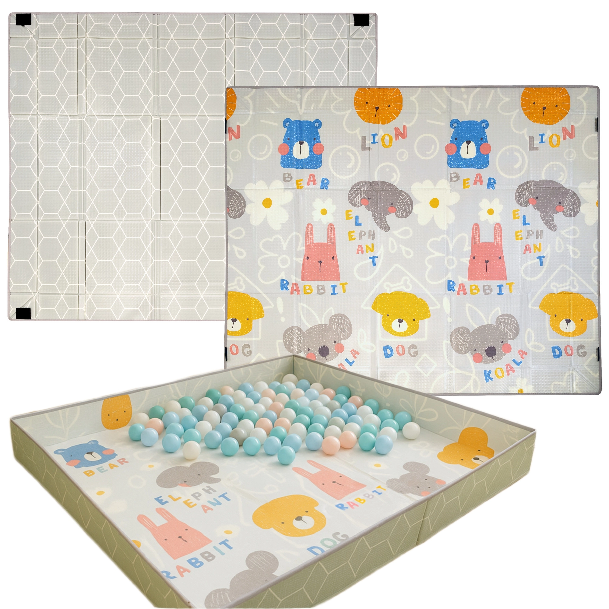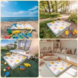 Specjalne rzepy pozwalają w kilka chwil unieść krawędzie i stworzyć miękką przestrzeń jak w kojcu lub ball pit – wystarczy dodać piłeczki. Mata jest składana, lekka i łatwa w czyszczeniu (wystarczy wilgotna ściereczka). W zestawie znajdziesz także praktyczną torbę transportową na zamek do wygodnego przechowywania i przenoszenia.