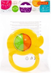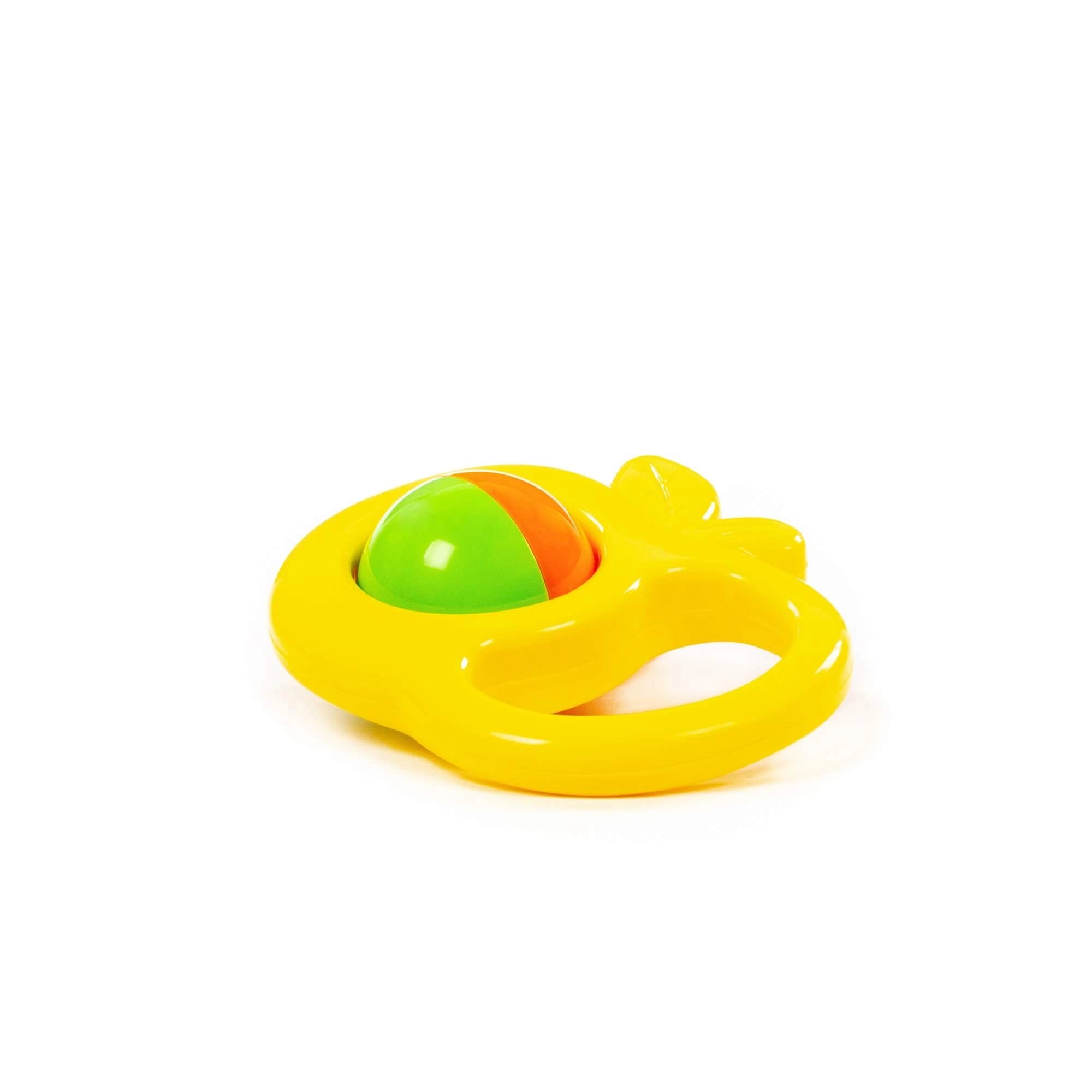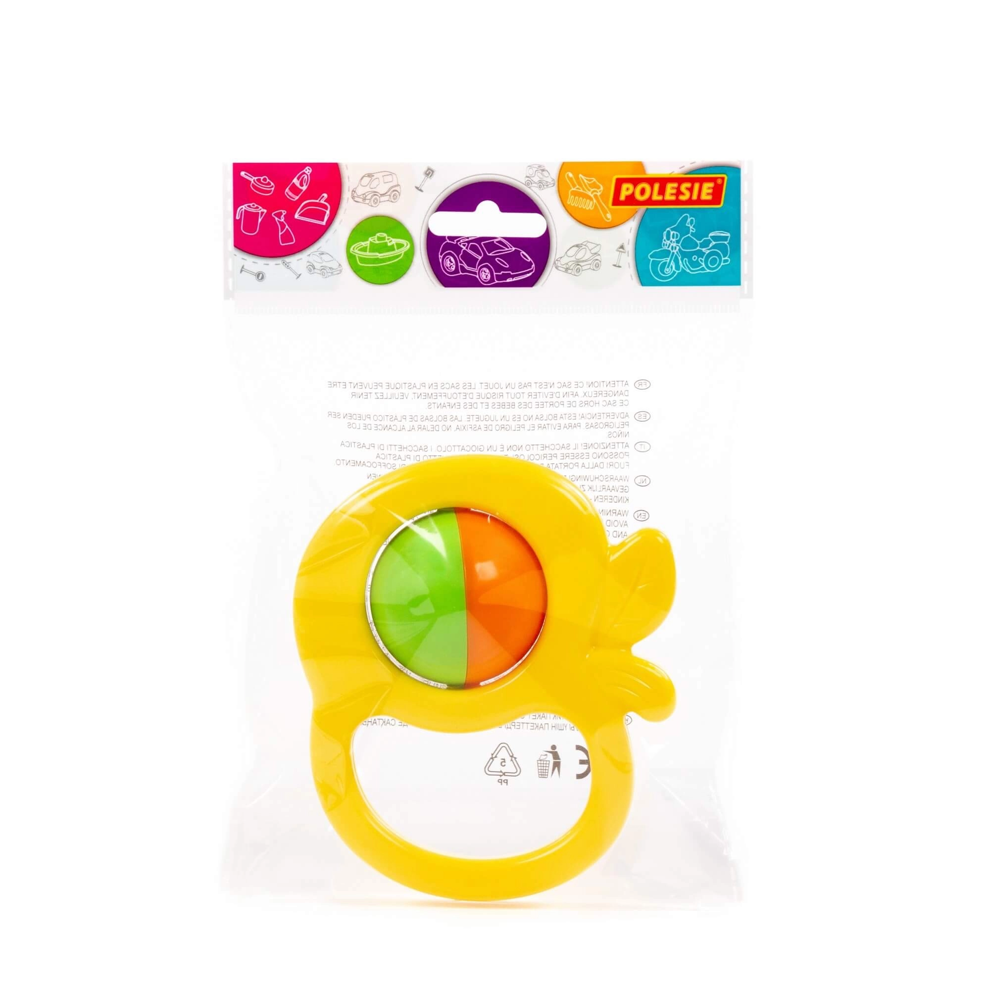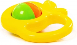 Dwukolorowa kuleczka w środku obraca się i grzechocze podczas ruchu, wspierając stymulację słuchową i wzrokową.