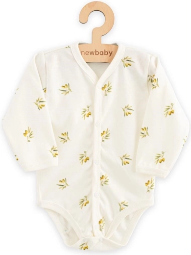 To niemowlęce body NEW BABY z motywem oliwek uszyto ze 100% bawełny organicznej, która jest wyjątkowo miękka, oddychająca i delikatna dla wrażliwej skóry dziecka. Dzięki zapięciu na napy rozpinanemu na całej długości i w kroku ubieranie oraz przewijanie jest szybkie i bez zbędnego przekręcania maluszka.