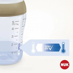 W opakowaniu znajdują się trzy butelki niemowlęce z praktycznym wskaźnikiem kontroli temperatury oraz jeden silikonowy smoczek. Butelki są kompatybilne w obrębie linii NUK Perfect Match i spełniają normę EN 14350 dla bezpiecznego karmienia.
