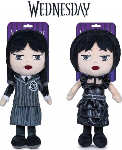 Uroczy i starannie wykonany pluszak Wednesday Addams o wysokości 32 cm ucieszy fanów seriali i kolekcjonerów. Wiernie oddaje jej gotycki styl – czarna sukienka, ciemne warkocze i poważny wyraz twarzy. Wykonany z miękkiego pluszu z haftowanymi detalami dla bezpiecznego i przyjemnego przytulania.