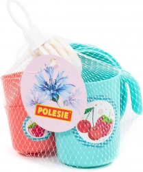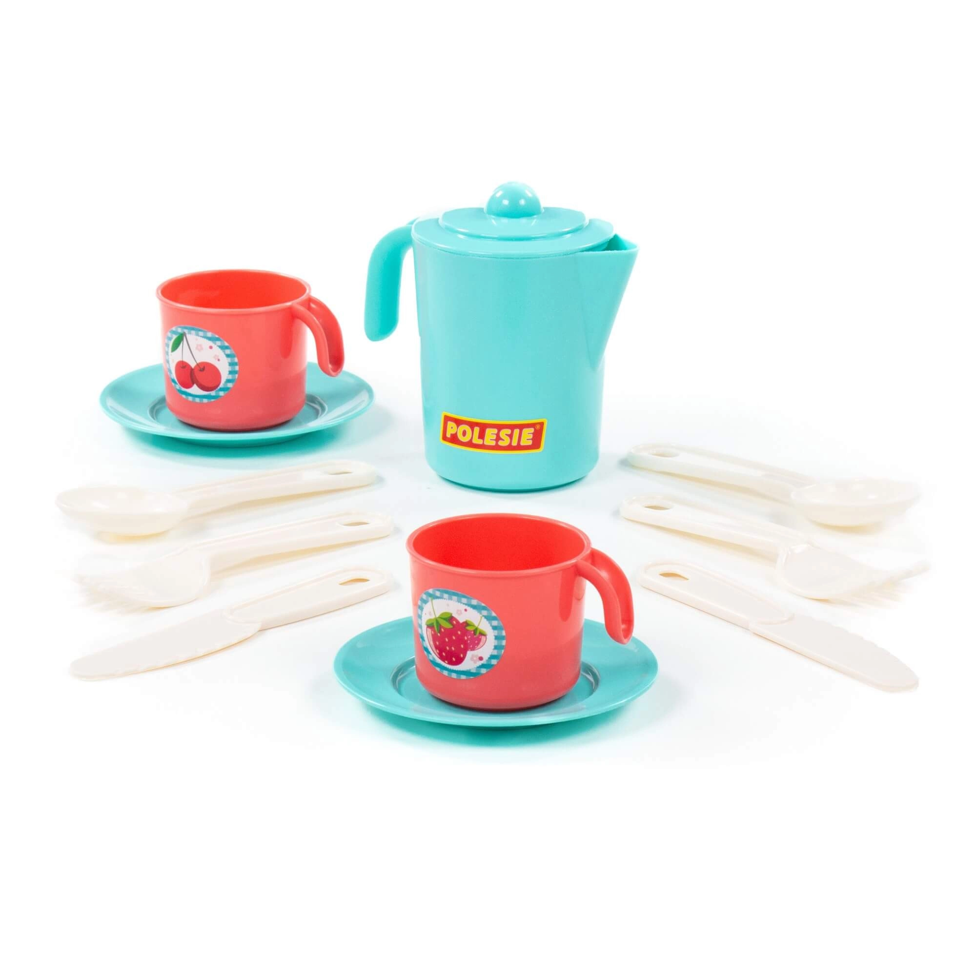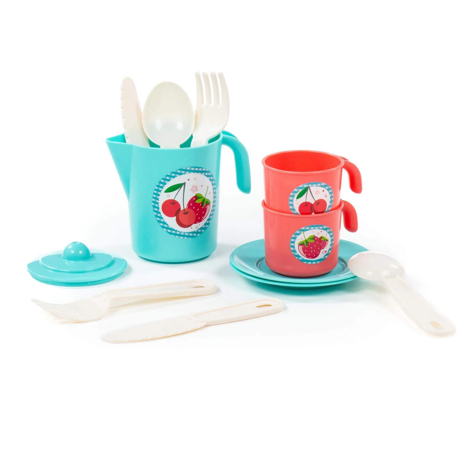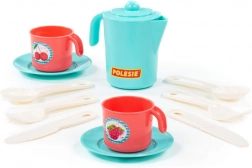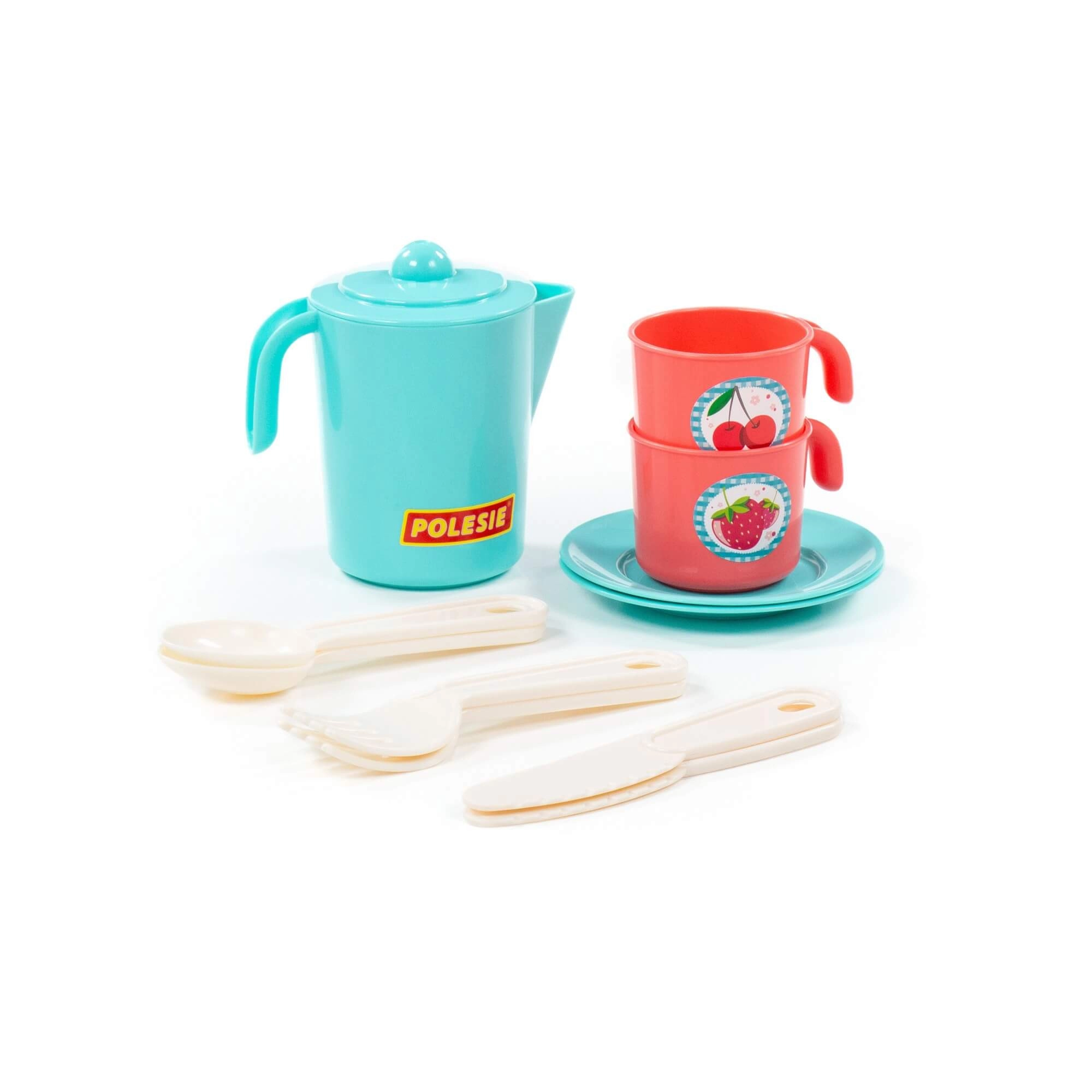 Komplet zawiera czajniczek z pokrywką, 2 filiżanki z uszkami, talerzyki/spodki oraz plastikowe sztućce. Dzięki bezpiecznym, gładkim krawędziom i niskiej wadze naczynia są łatwe w użytkowaniu. Kompaktowe wymiary ok. 130 × 105 × 121 mm ułatwiają przechowywanie i przenoszenie.