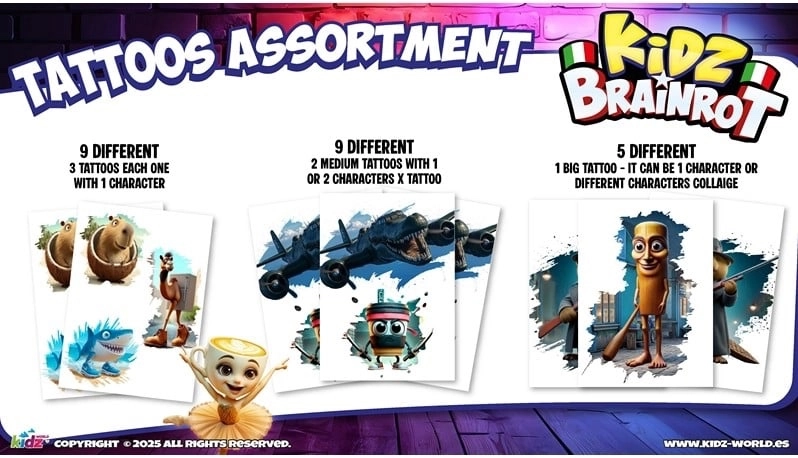 Pakiet Italian Brainrot dostarcza dawkę rozrywki i kolekcjonerskich emocji. W każdym opakowaniu otrzymasz 4 karty i 4 tymczasowe tatuaże z tematyką Italian Brainrot, zawsze w losowej mieszance motywów. Świetne do wymian ze znajomymi, kolekcjonowania ulubionych wzorów i urozmaicenia stylu.