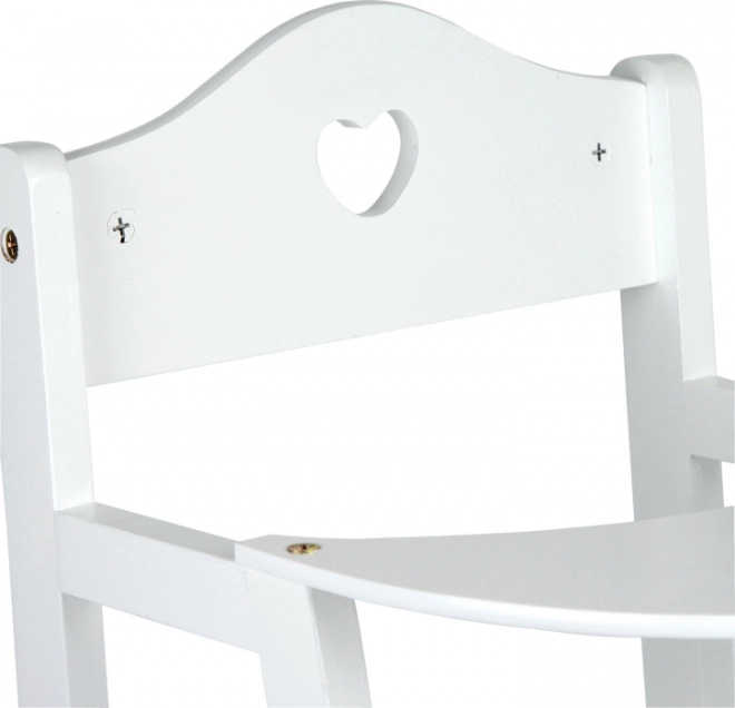 To drewniane krzesełko do karmienia lalek w czystej bieli jest stylowym dodatkiem do pokoju dziecięcego i salonu. Subtelne wycięcie serca w oparciu nadaje uroczy wygląd, a solidna konstrukcja gwarantuje bezpieczną i długotrwałą zabawę.