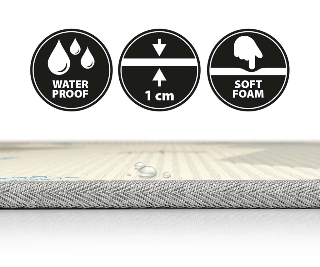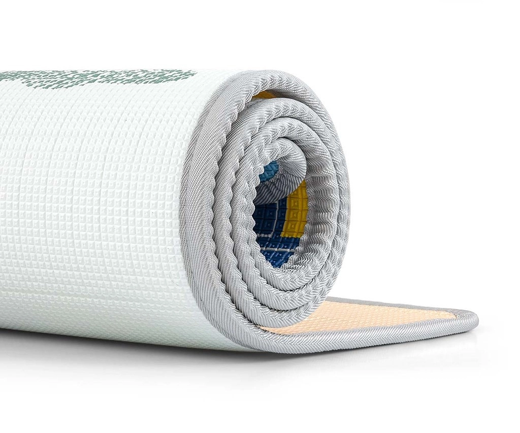 Materiał XPE jest wolny od formamidu, ftalanów, PVC i BPA, antyalergiczny i łatwy w utrzymaniu – wystarczy przetrzeć wilgotną ściereczką. Mata jest lekka, łatwo się zwija i przechowuje, idealna także w podróży lub do użytku na zewnątrz na równej powierzchni. Spełnia europejskie normy bezpieczeństwa EN 71.