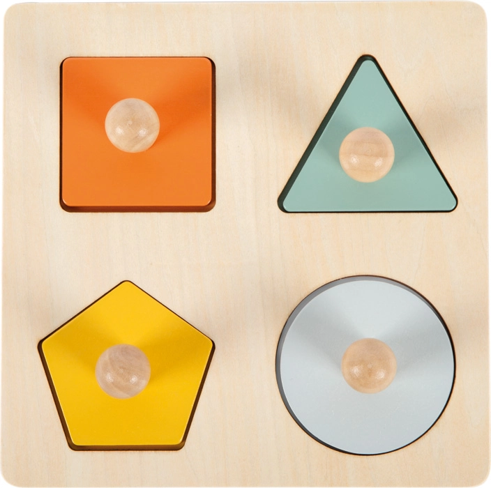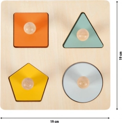 Ta solidna układanka została zaprojektowana z myślą o małych dziecięcych rączkach. Każdy z czterech kolorowych elementów ma praktyczny drewniany uchwyt, dzięki czemu wygodnie się go trzyma i wkłada w odpowiednie otwory. Pod kształtami dzieci odkryją miłe ilustracje tygrysa, krokodyla i lamparta, a także bezpieczne lusterko, które wspiera ciekawość i zachęca do zabawy interakcyjnej.