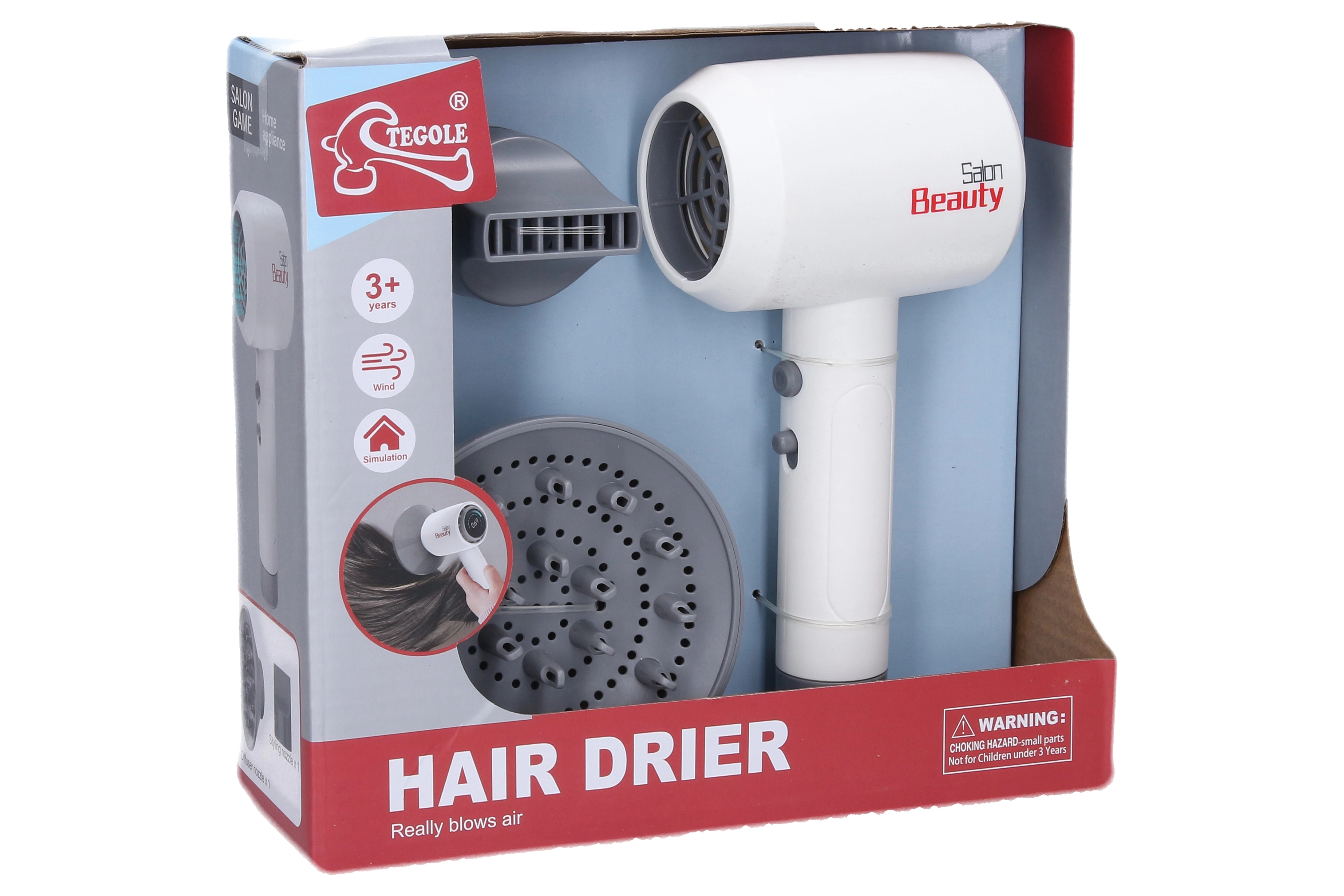 Zabawka została zaprojektowana z myślą o bezpiecznej domowej zabawie – posiada przycisk on/off oraz jeden dekoracyjny przycisk bez funkcji. Suszarka jest zasilana 1× baterią AA (nie jest dołączona do zestawu), dzięki czemu można ją łatwo zabrać wszędzie.