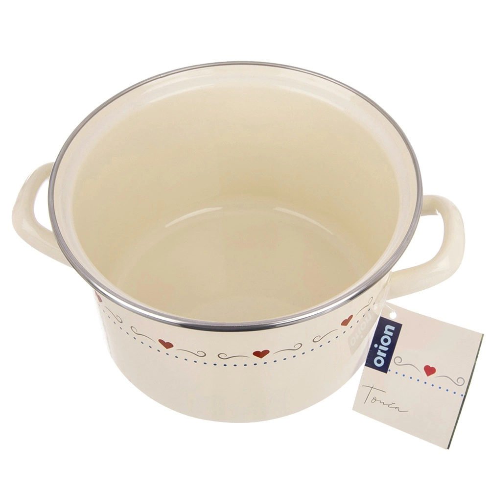 Kremowy emaliowany garnek TONCA łączy retro wygląd z nowoczesną funkcjonalnością. Bezpieczna dla zdrowia stal emaliowana jest gładka, łatwa w czyszczeniu i odpowiednia także dla alergików. Elegancki dekor z serduszkami oraz nierdzewna krawędź zapewniają naczyniu trwałość i szyk do codziennego gotowania oraz serwowania bezpośrednio na stół.