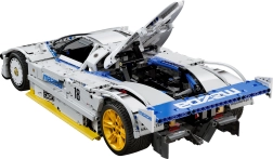 Wierna replika zwycięzcy Le Mans z 1991 roku wyróżnia się niską, aerodynamiczną sylwetką, białą karoserią z niebieskimi akcentami oraz dopracowanymi detalami. Kinetyczny model silnika obrotowego nadaje konstrukcji technicznego charakteru, a gumowe opony o różnych rozmiarach wiernie odwzorowują specyfikację wyścigową.