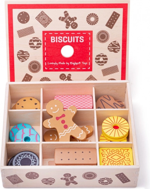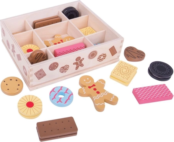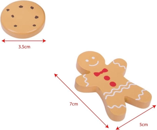 Przedstawiamy drewniane pudełko z zabawkami ciastek, które zawiera wybór ulubionych ciastek, w tym pierniczki i inne smakołyki. Ten zestaw pozwala małym dzieciom rozwijać swoją kreatywność poprzez zabawę inspirowaną pieczeniem.
