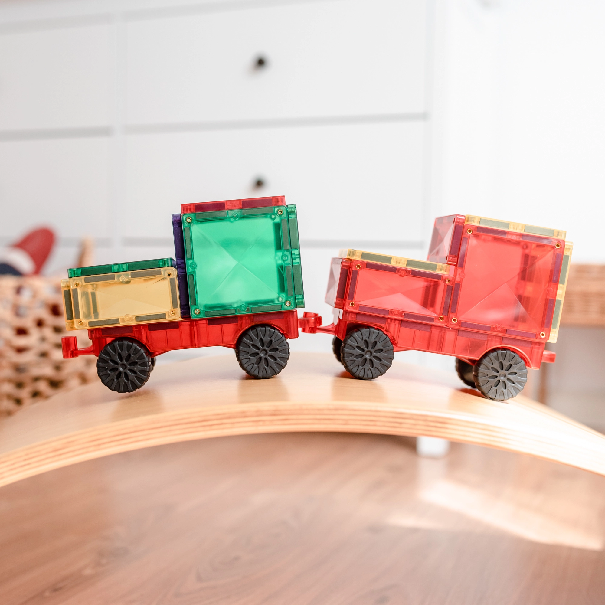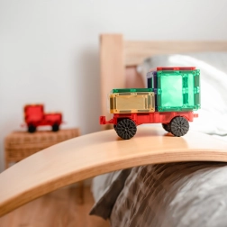 Dwa podwozia z kołami zmienią klocki w dynamiczną zabawę – od ciężarówek po pociągi. Buduj, łącz i ruszaj w drogę.