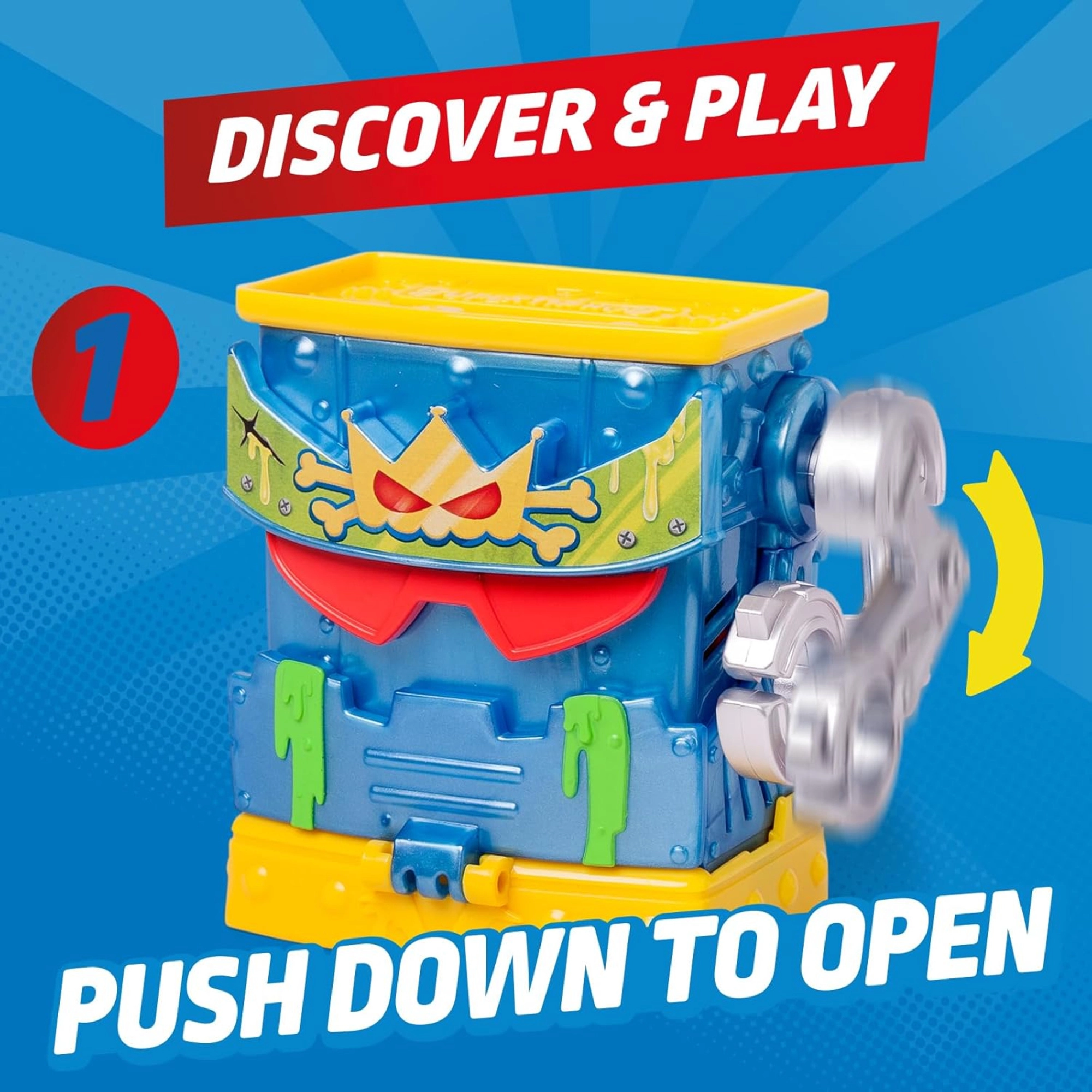 Przechytrz mechanizmy obronne, zdobądź cenne kapsuły energii Kazoom i zostań bohaterem Kaboom City. Tajna baza MR KING jest pełna niespodzianek – obrotowe i przesuwne panele, fałszywe drzwi oraz sprytne pułapki sprawdzą twoją szybkość i pomysłowość. Zestaw idealny do samodzielnej zabawy i rywalizacji w duecie.