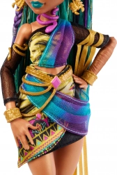 Nefera De Nile, starsza siostra Cleo, zachwyca od pierwszego spojrzenia. Połączenie intensywnych odcieni fioletu, turkusu i złota, bogato zdobiona biżuteria oraz dopracowane detale stroju inspirowane starożytnym Egiptem czynią z tej lalki wyrazisty element do zabawy i ekspozycji. Artykułowane kończyny (szyja, ramiona, łokcie, biodra i kolana) umożliwiają naturalne pozowanie i stylowe sesje zdjęciowe.