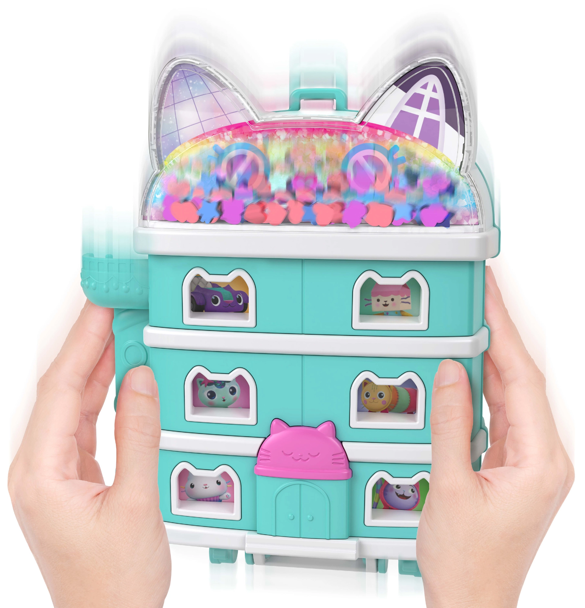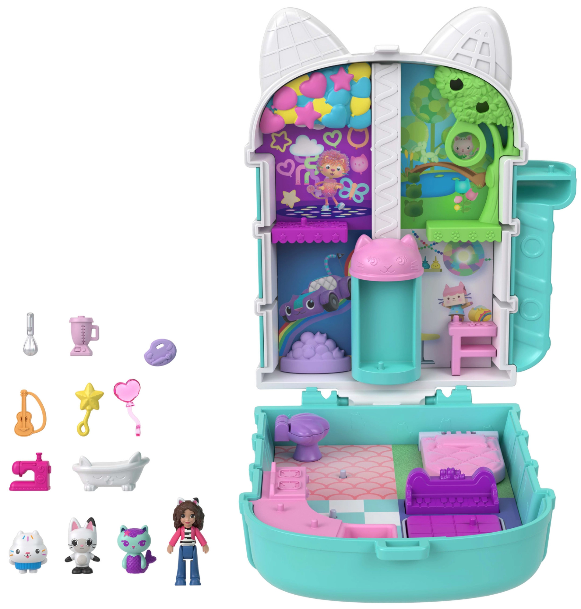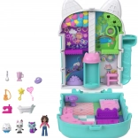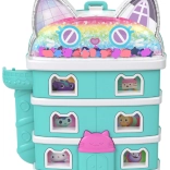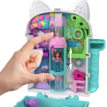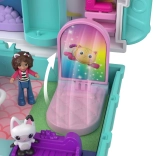 Kompaktowy koci domek Polly Pocket przynosi dzieciom bogaty świat wyobraźni w małym, przenośnym etui. Po otwarciu odsłania wielopoziomowe wnętrza z tematycznymi pokoikami, błyszczącą kopułą i ruchomymi elementami, które zachęcają do historii inspirowanych GABBY’S DOLLHOUSE.
