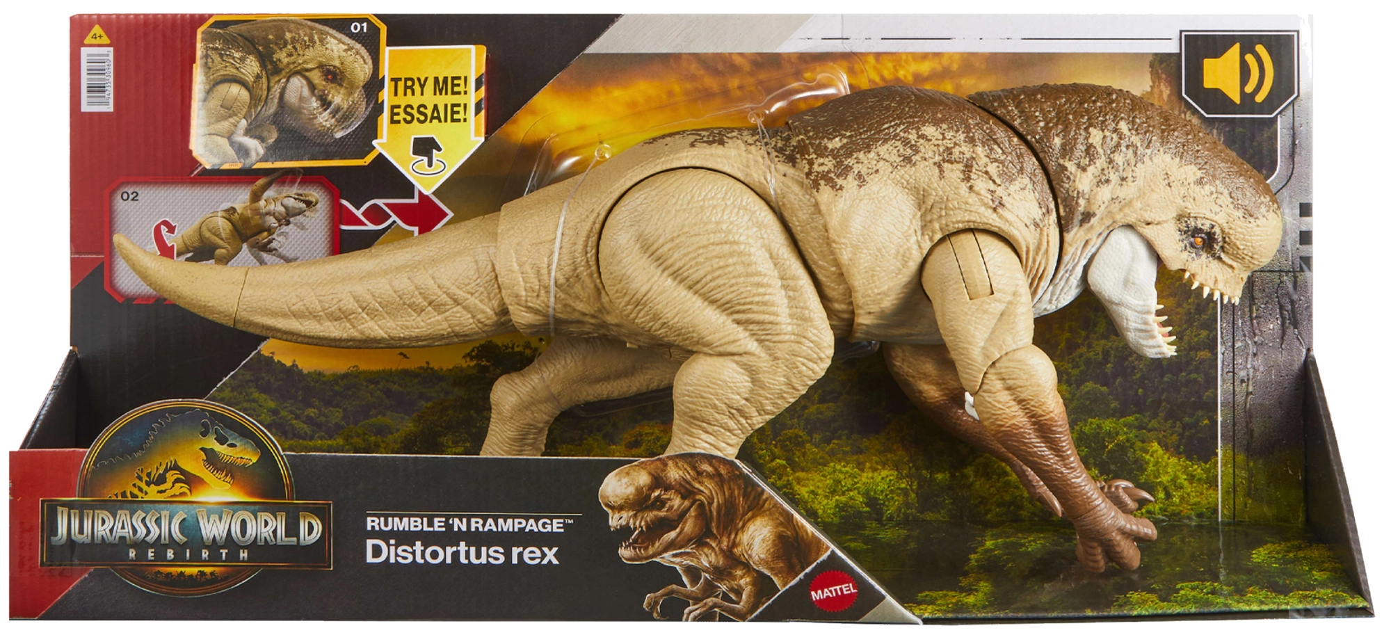 Przygotuj się na spektakularne starcia z realistyczną figurką Distortus Rex o wysokości ok. 50 cm z serii JURASSIC WORLD Odrodzenie marki Mattel. Dinozaur oferuje przerażający ryk po naciśnięciu przycisku, gryzienie z ruchem przednich kończyn oraz boczny atak sterowany ogonem. Dzięki szczegółowej fakturze skóry, wysokiej artykulacji i interakcji AR w aplikacji to idealny prezent dla małych poszukiwaczy przygód i fanów dinozaurów.