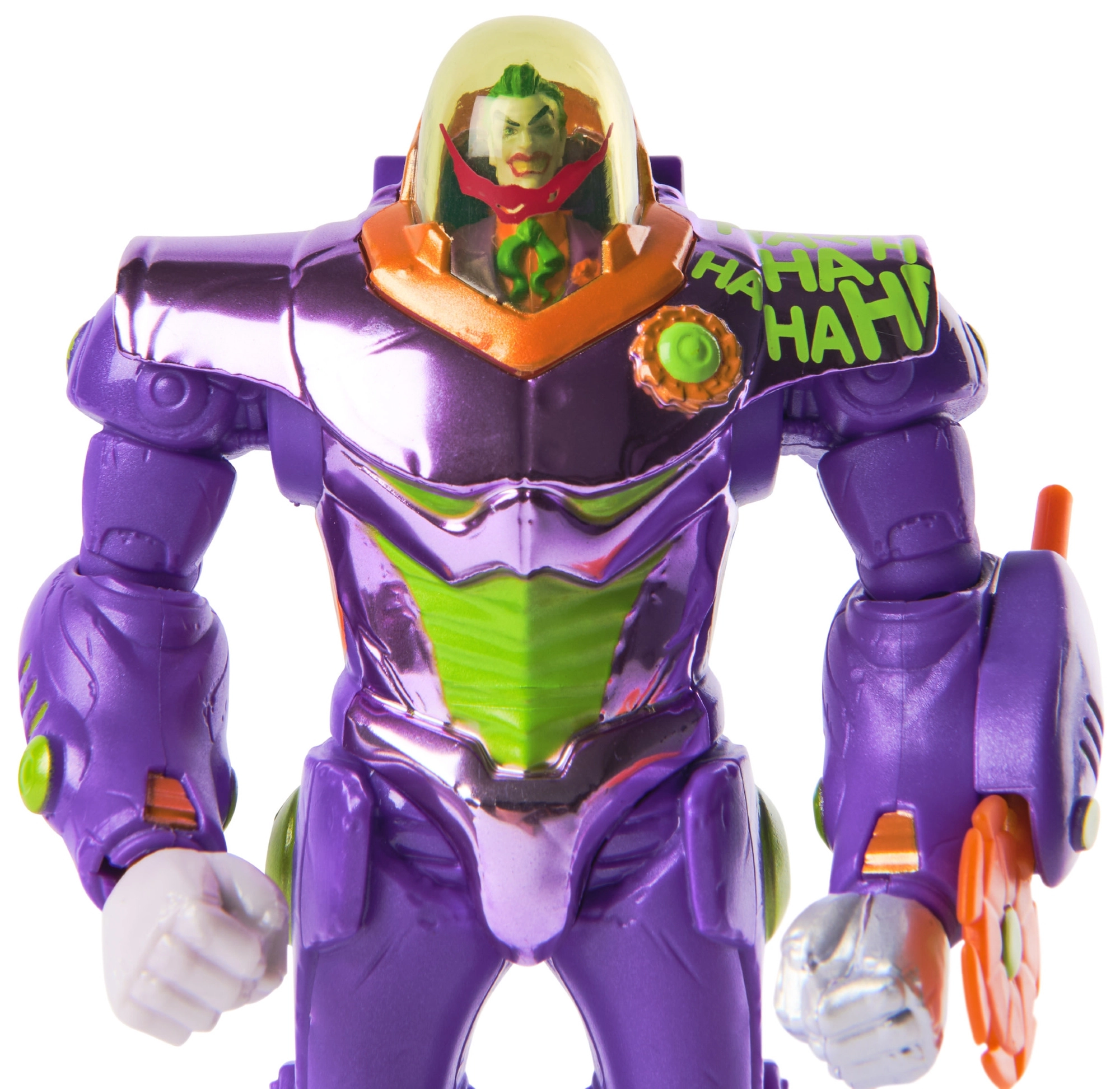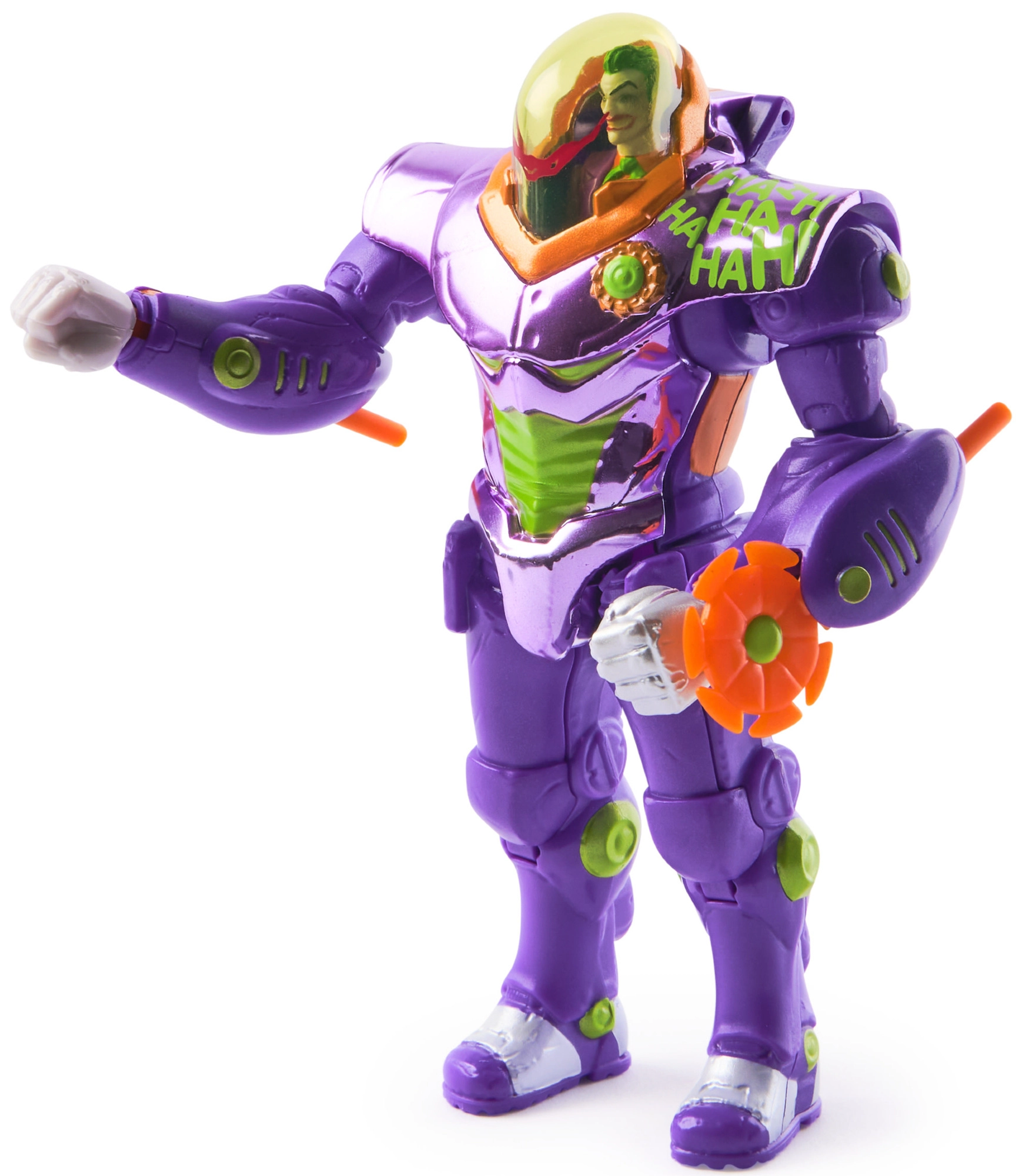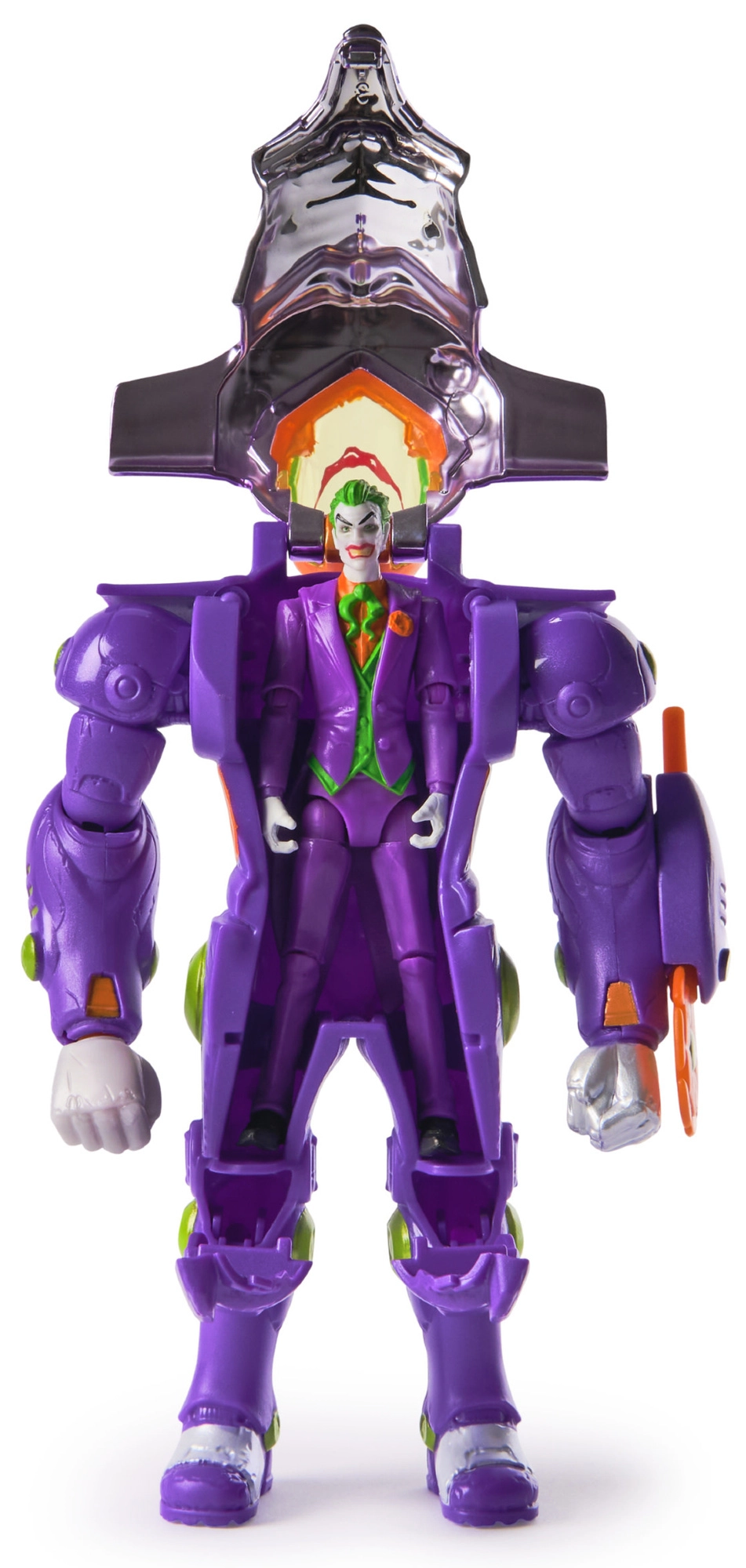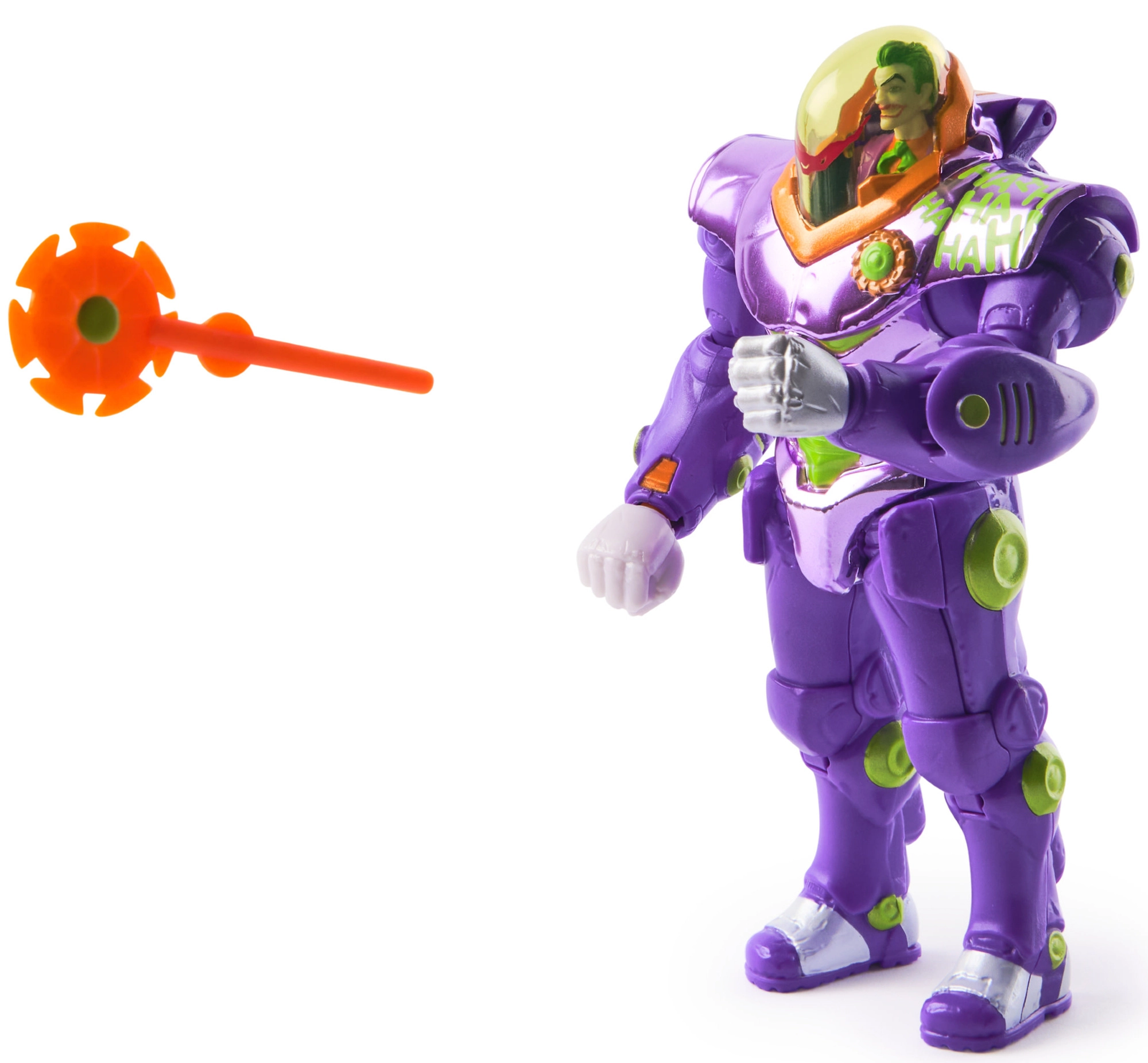 Duży fioletowy pancerz z przezroczystą osłoną mieści 10‑cm figurkę THE JOKER. Otwierana górna część umożliwia szybkie osadzenie figurki i przygotowanie do akcji.