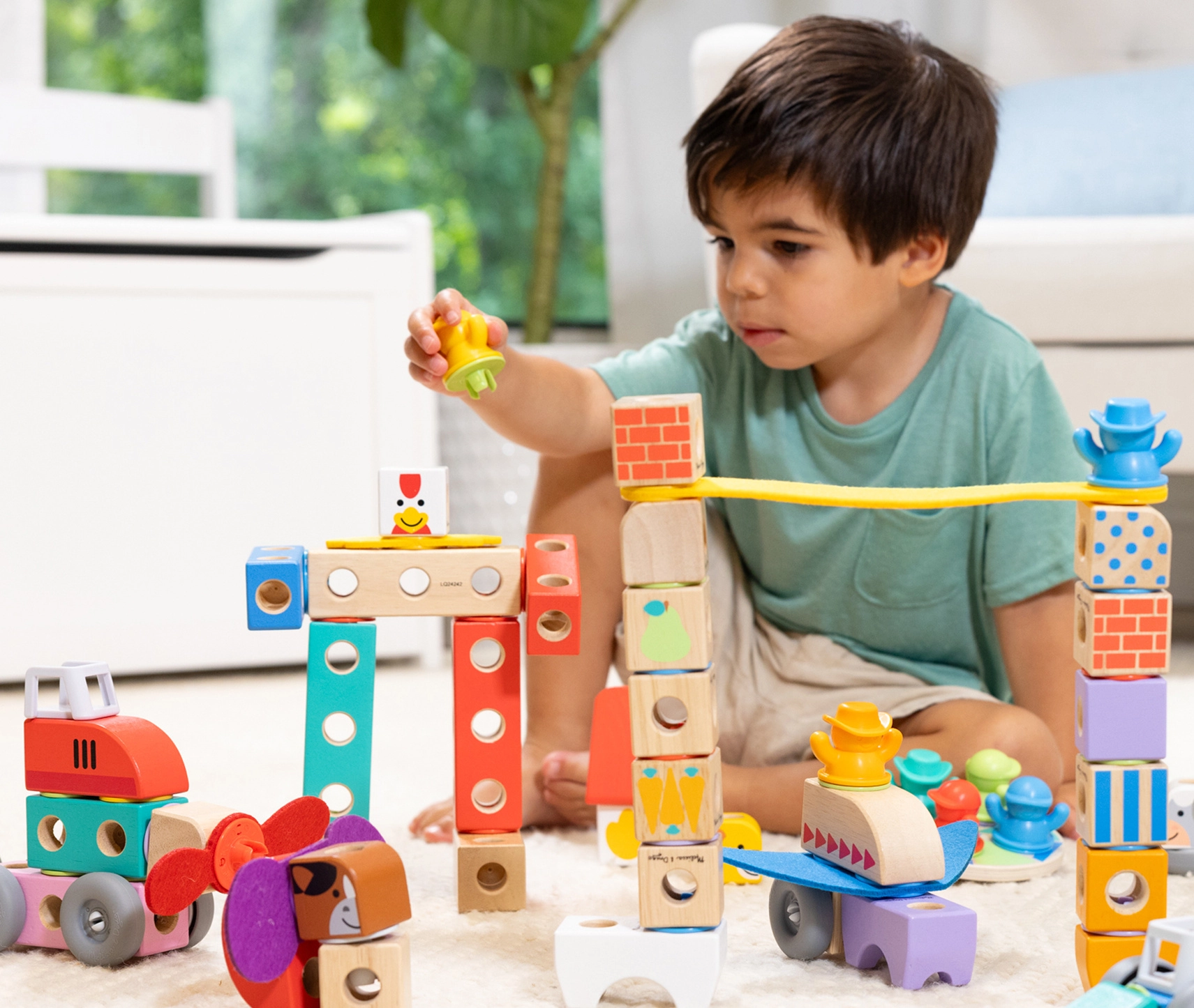 Klocki rozwijają kluczowe umiejętności: małą motorykę, koordynację ręka–oko, kreatywność i logiczne myślenie. Dzieci mogą układać, łączyć, obracać i jeździć gotowymi konstrukcjami. Wysokiej jakości drewno z certyfikatem FSC i wytrzymałe wykonanie zapewniają długą żywotność nawet przy codziennej zabawie.