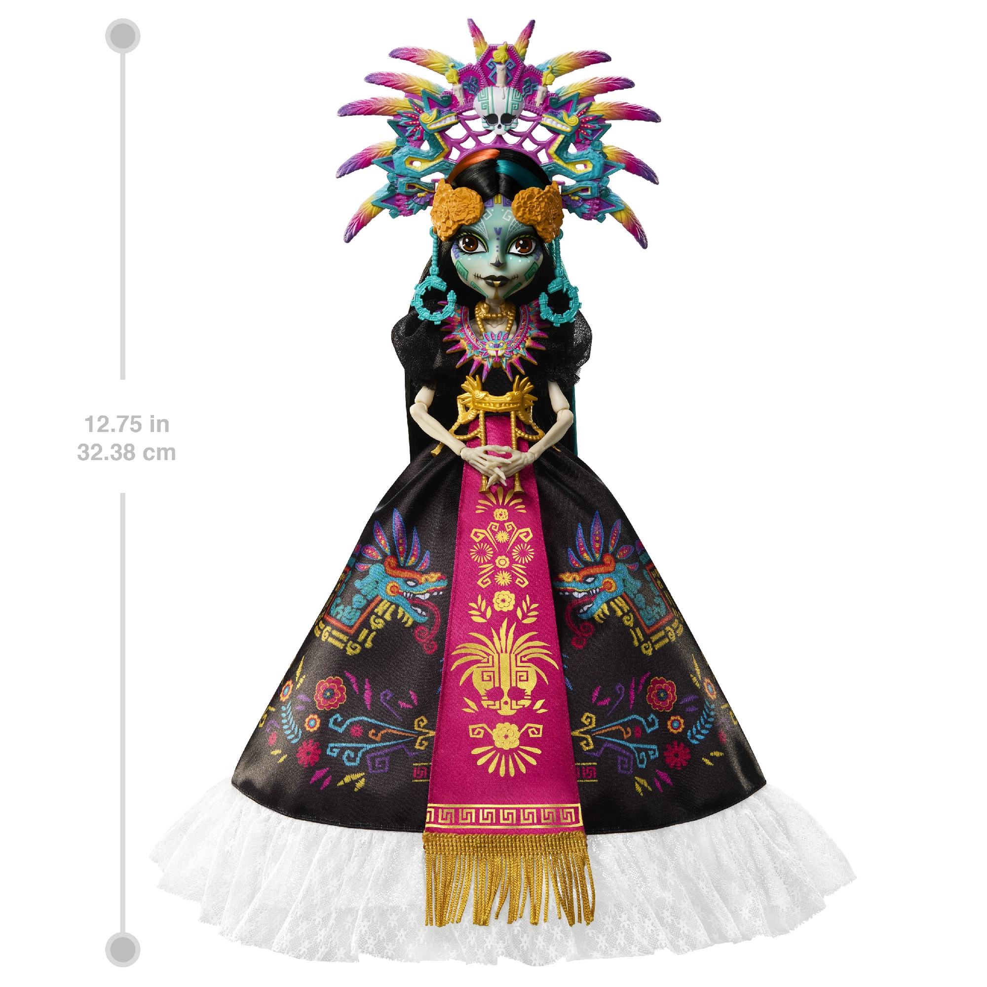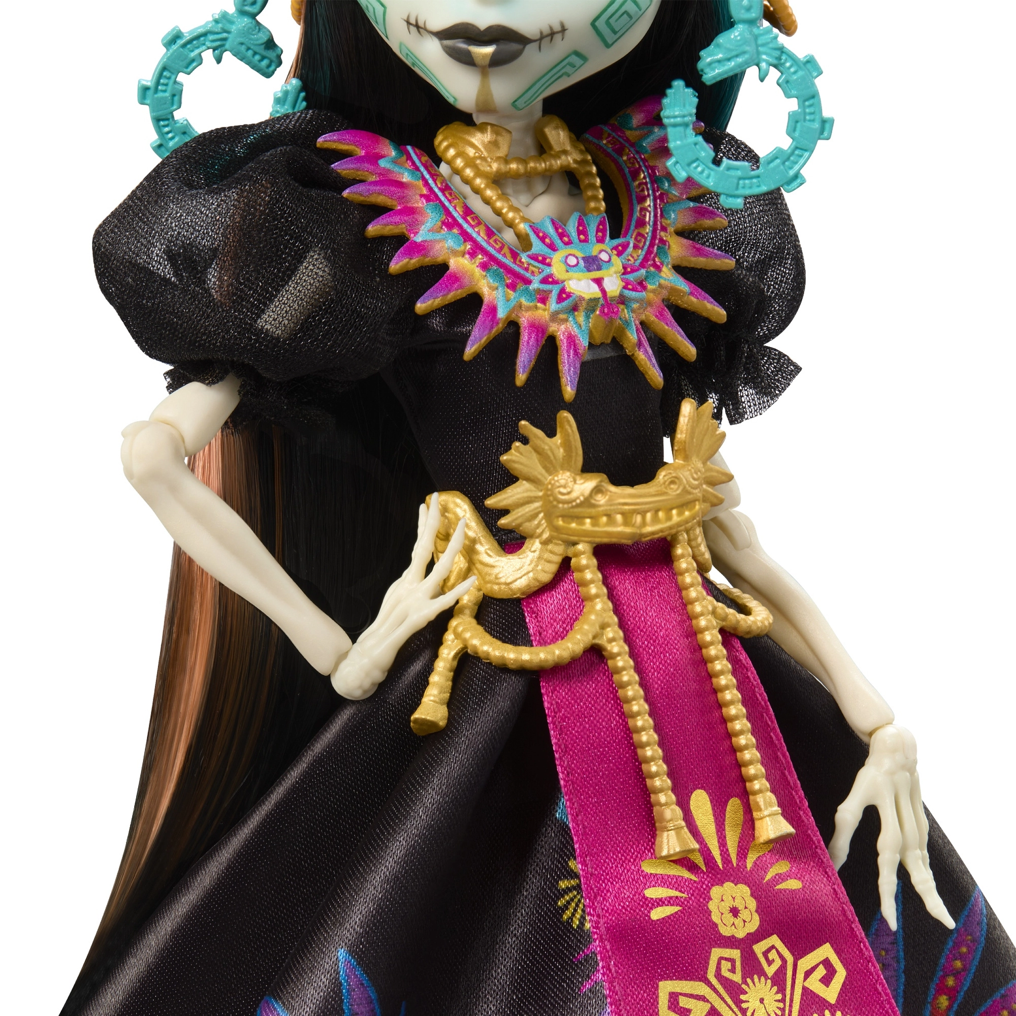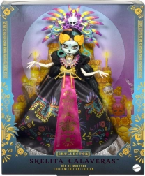Kolekcjonerska edycja Monster High Skullector oddaje hołd meksykańskiemu świętu Día de Muertos. Skelita Calaveras zachwyca długą czarną suknią o satynowym połysku, kolorowymi nadrukami i wyrazistą magentową szarfą ze złotymi frędzlami. Dominująca piórkowa opaska, efektowna biżuteria i szczegółowy face paint czynią z niej wyjątkowy egzemplarz dla fanów designu i kultury.