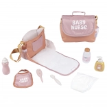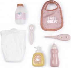 Butelka, termometr, syrop z łyżeczką, dozownik na szampon, śliniaczek i pieluszka – kompletny zestaw do realistycznej zabawy w opiekę.
