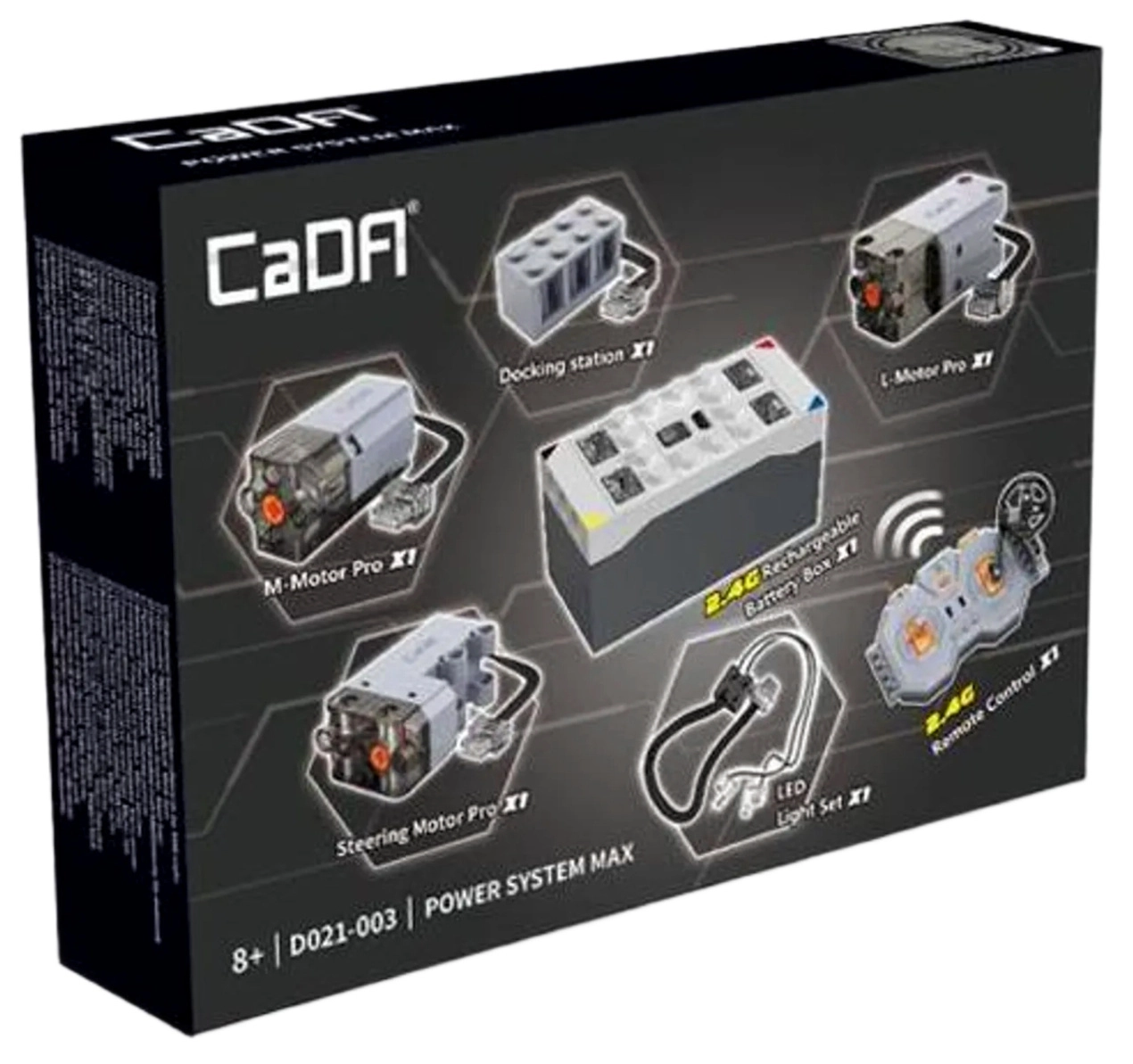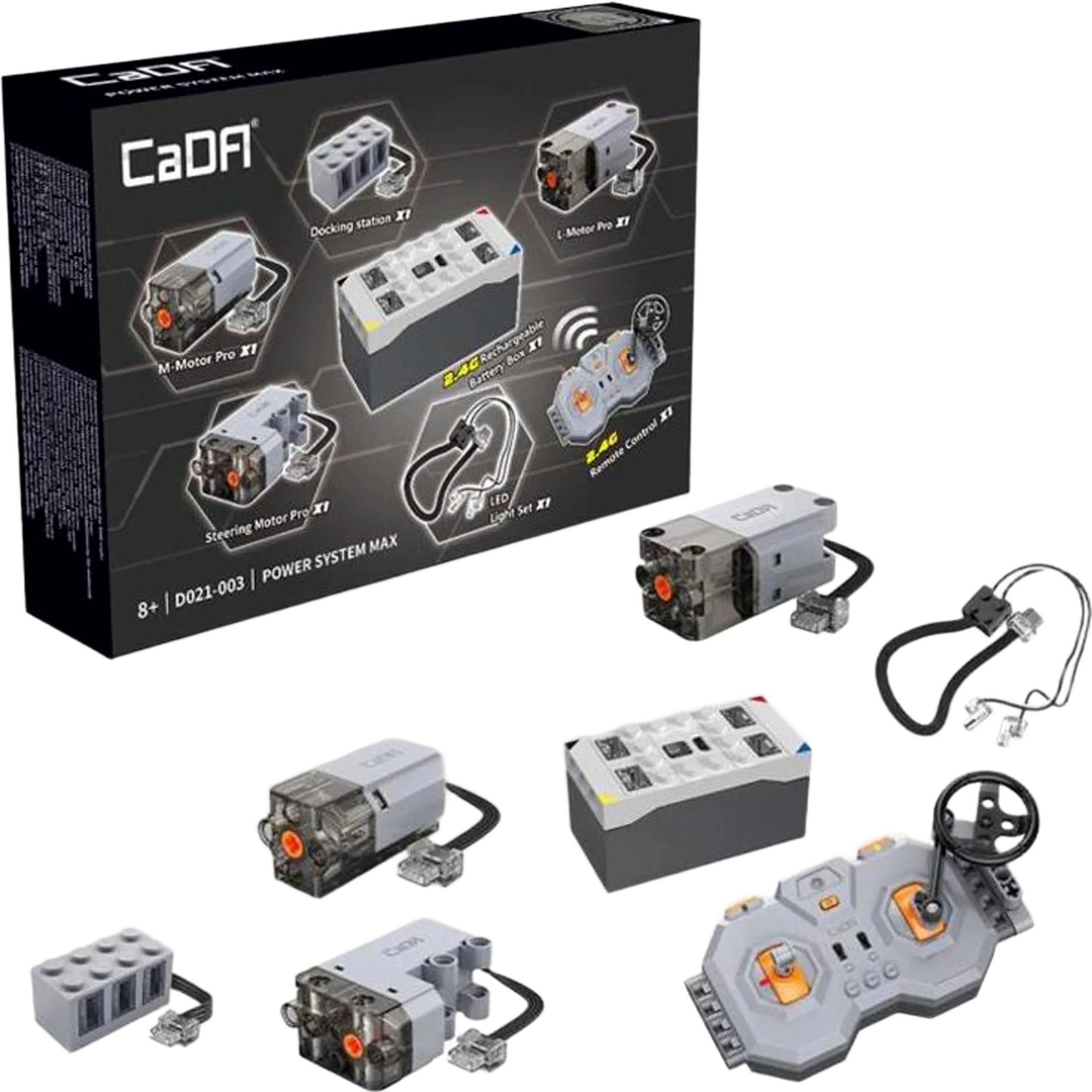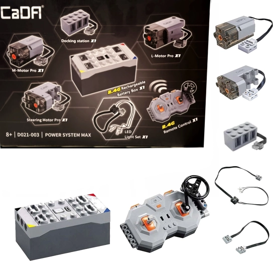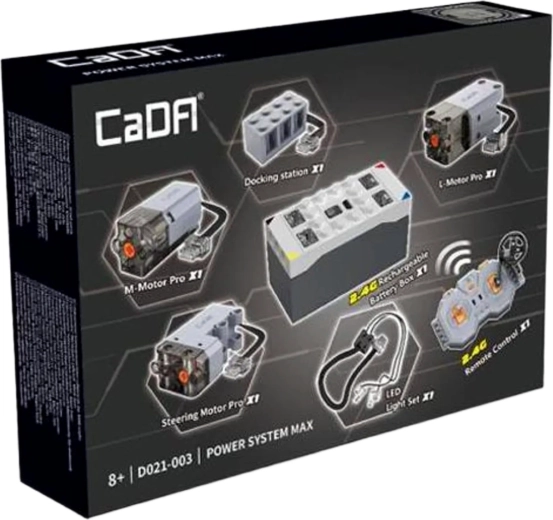 Rozszerz swoje zestawy o realistyczny napęd i zdalne sterowanie 2,4 GHz dzięki zestawowi CaDA Power System MAX. Zestaw zawiera akumulator, trzy wydajne silniki Pro (M, L, Steering), oświetlenie LED, pilot zdalnego sterowania oraz przewód do ładowania USB dla długiej i płynnej zabawy bez zakłóceń.
