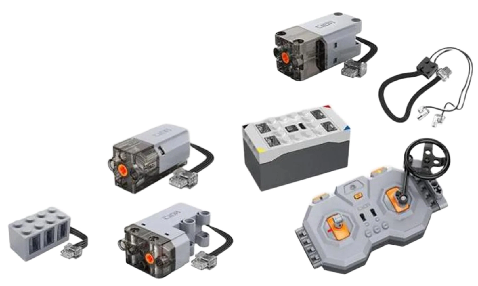 - Akumulator, pilot 2,4 GHz, M Motor Pro, L Motor Pro, Steering Motor Pro, oświetlenie LED, przewód USB do ładowania