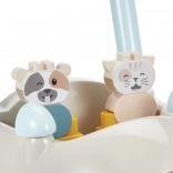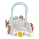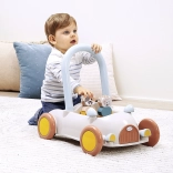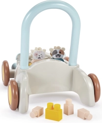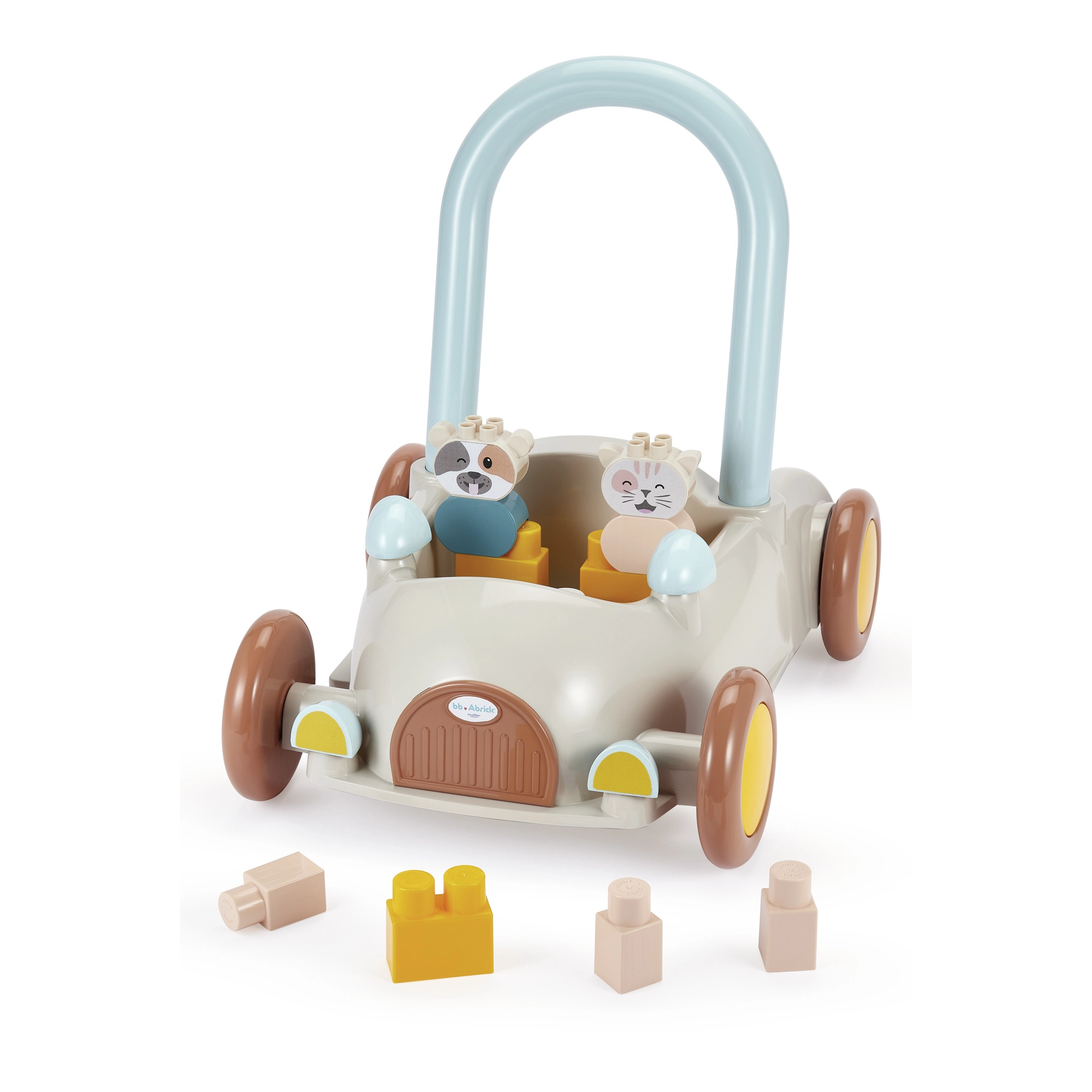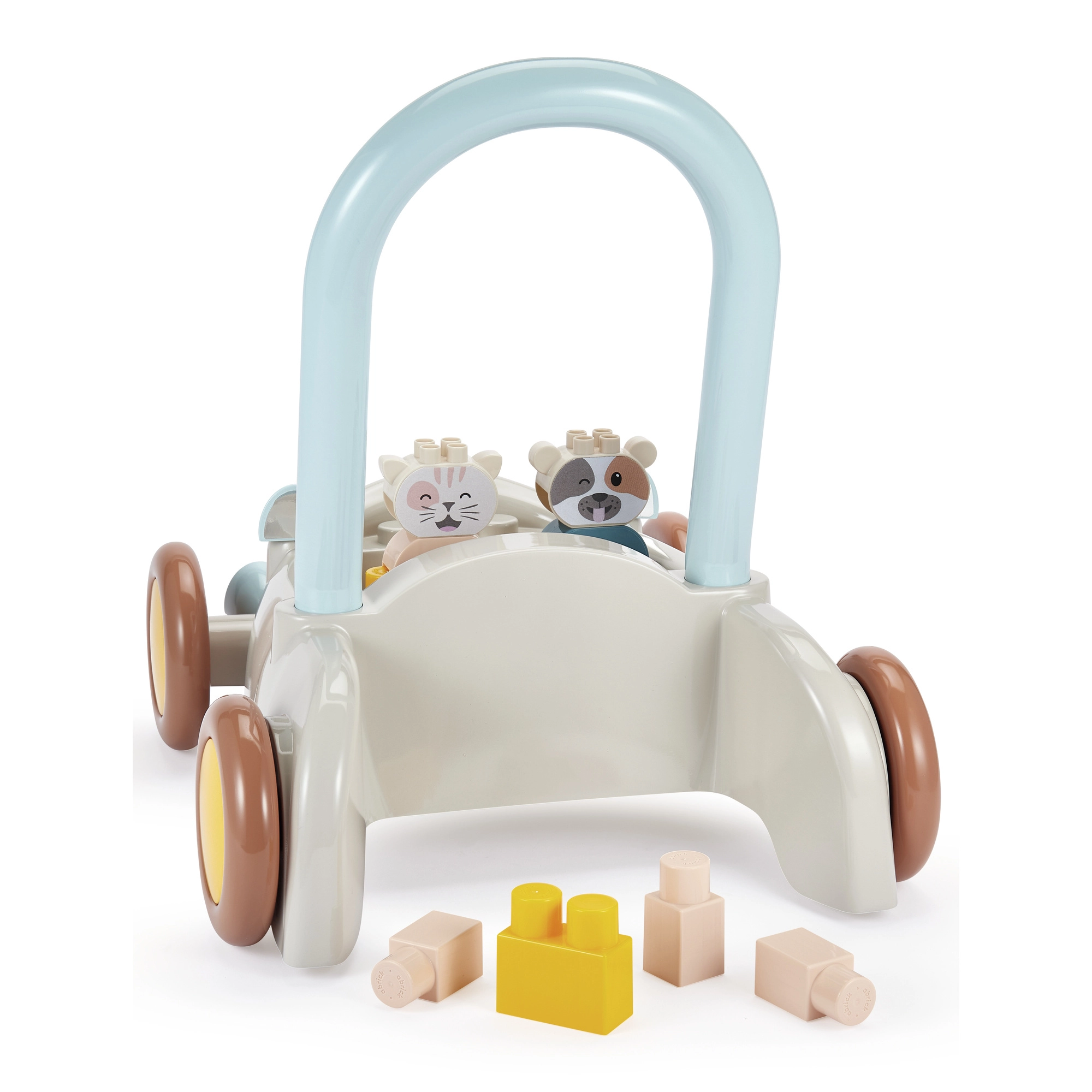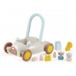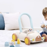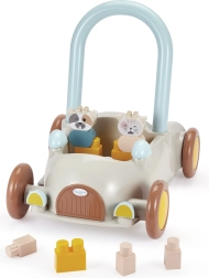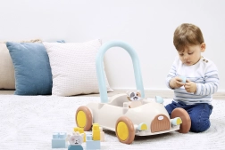 Odkryj wielofunkcyjny pchacz z klockami, który pomoże maluchom w stawianiu pierwszych kroków i jednocześnie zapewni zabawę przy układaniu. Pojazd ma praktyczny uchwyt do pchania lub ciągnięcia, szerokie kółka dla pewnego poruszania się oraz miejsce na klocki w środku. W komplecie znajduje się około 16 klocków oraz dwie urocze figurki kotka i krówki, które pobudzają wyobraźnię i zabawę tematyczną.