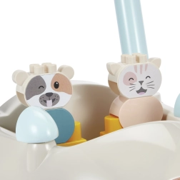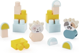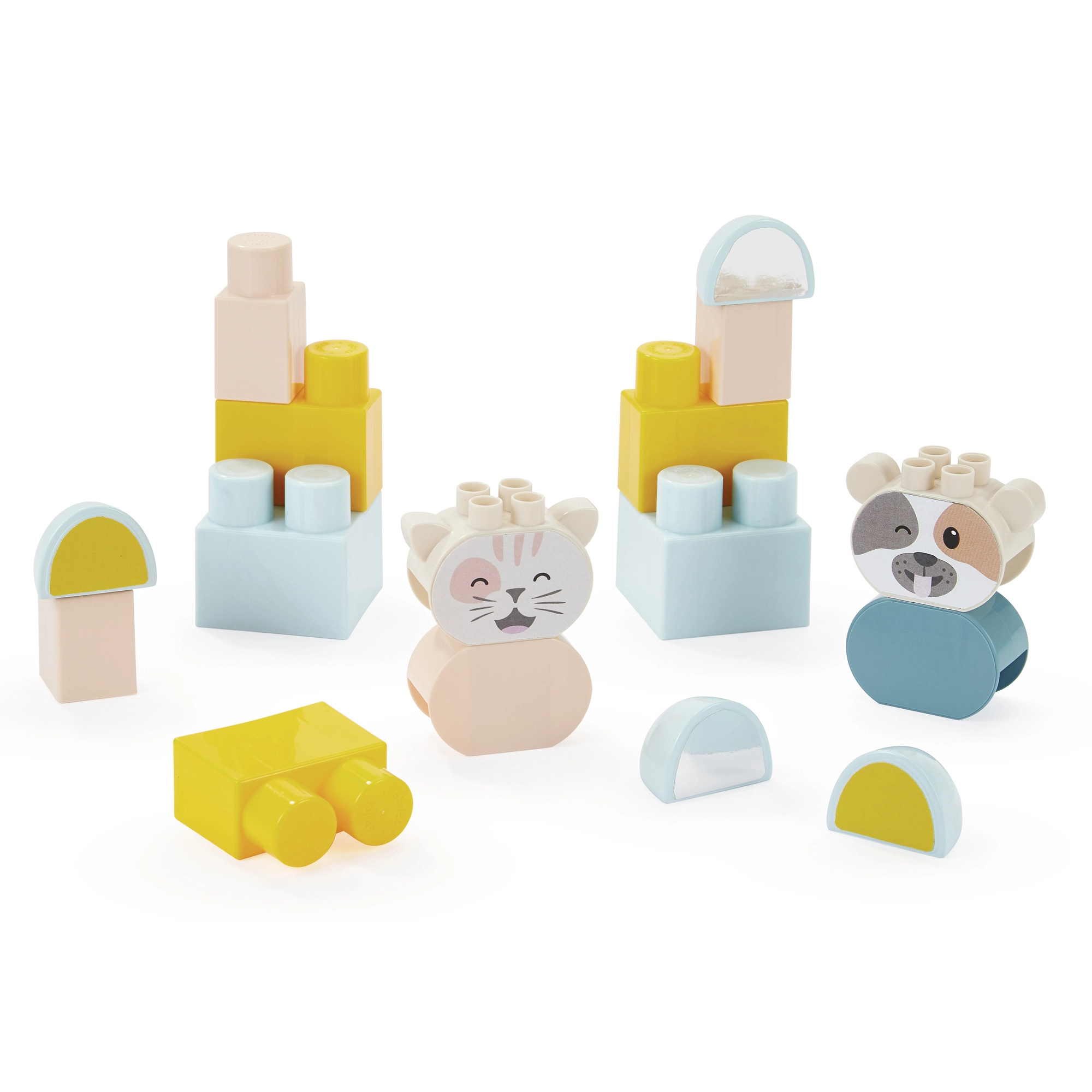 Zestaw zawiera około 16 klocków oraz dwie figurki kotka i krówki. Duże, zaokrąglone elementy są idealne dla małych rączek i wspierają kreatywne budowanie.
