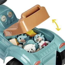 W zestawie znajduje się 15 klocków konstrukcyjnych, z których dziecko łatwo złoży krówkę i owieczkę, oraz inne elementy do kreatywnego budowania. Zestaw wspiera rozwój małej i dużej motoryki, koordynację oraz zabawę w odgrywanie roli farmera. Cały pojazd ma wymiary około 86 × 32,5 cm i jest idealny dla dzieci w wieku 12–36 miesięcy.
