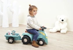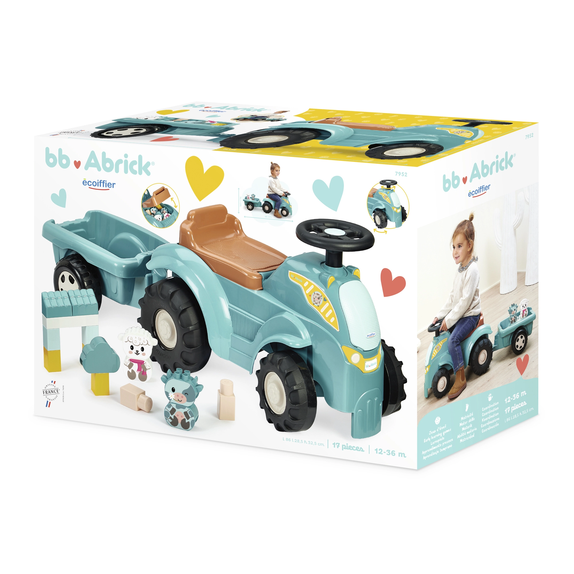 Ten solidny dziecięcy traktor z przyczepą marki ÉCOIFFIER z linii ABRICK jest stworzony do pierwszych wyścigów po salonie i w ogrodzie. Dzięki dużym kołom i wygodnemu siedzisku jazda jest stabilna i bezpieczna, a odłączana przyczepa pomieści klocki i ulubione zabawki. Praktyczny schowek pod siedziskiem utrzymuje drobiazgi zawsze pod ręką.