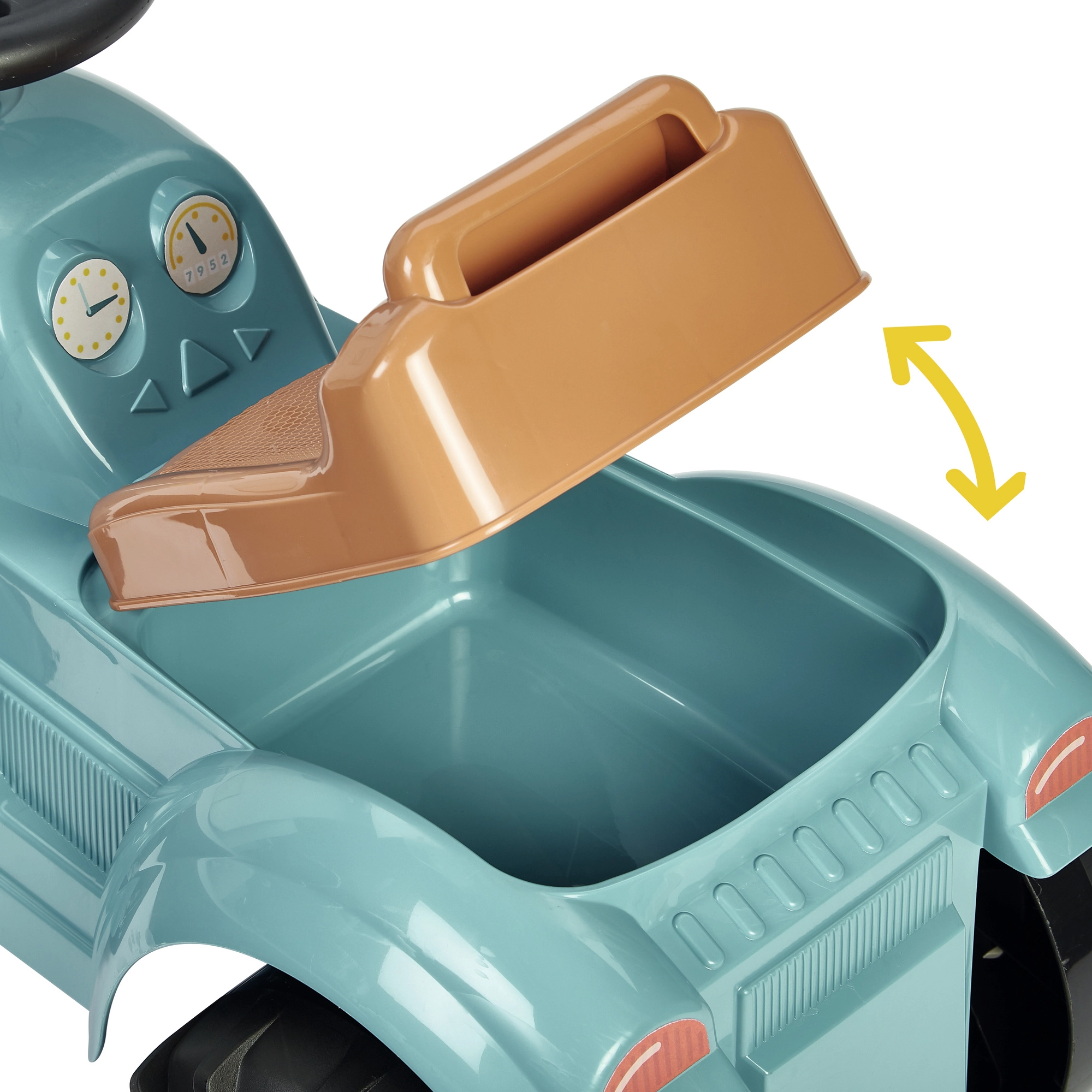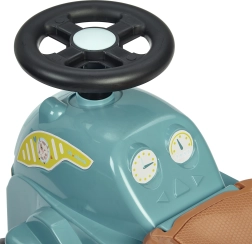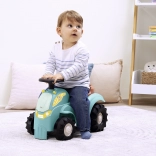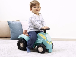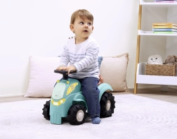 Ten jeździk traktor w kolorze turkusowo/niebieskim z brązowym siedziskiem i masywnymi czarnymi kołami został zaprojektowany dla najmłodszych. Dzięki wytrzymałemu plastikowemu korpusowi i szerokiemu rozstawowi kół jazda jest stabilna i bezpieczna, a kompaktowe wymiary ułatwiają użytkowanie we wnętrzach na dywanie i gładkiej podłodze.