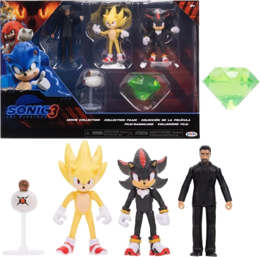 - 3 figurki (Sonic, Shadow, Agent Stone) + 2 akcesoria (Buzz Bomber, zielony Chaos Emerald)