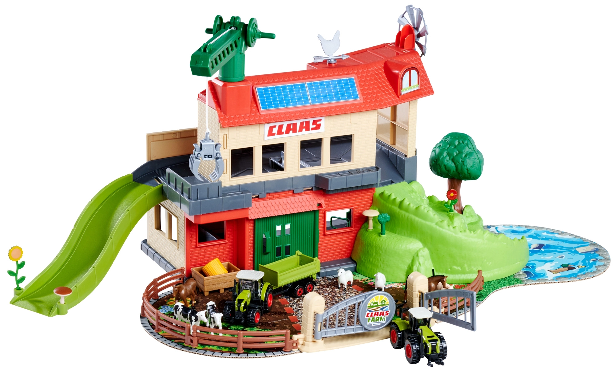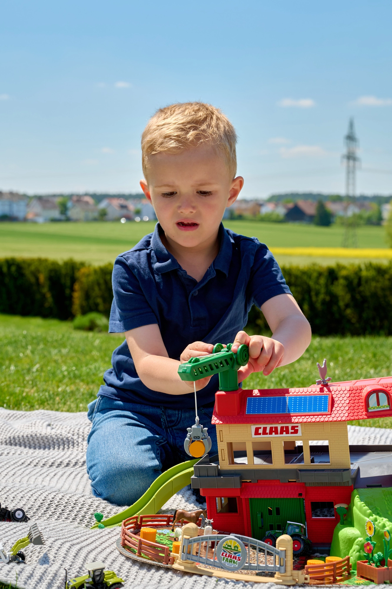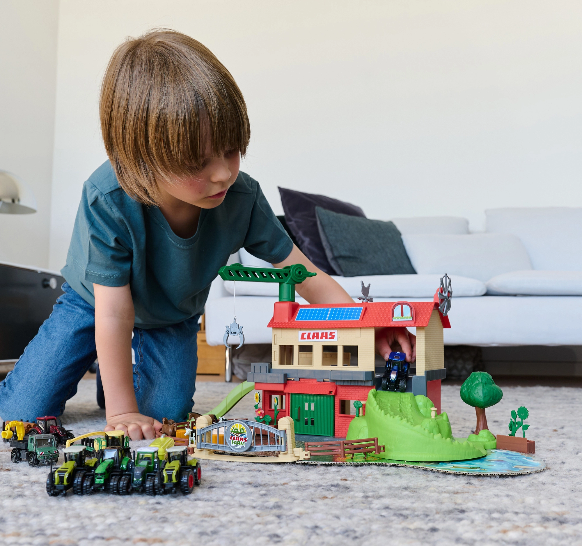 Duża farma CLAAS oferuje dzieciom autentyczne wiejskie doświadczenia. Dwupoziomowa konstrukcja ze stodołą, rampami i zagrodami zapewnia dużo miejsca dla pojazdów i zwierząt, a działający dźwig z bloczkiem pozwala podnosić bele siana i akcesoria między poziomami. Licencjonowane modele CLAAS zachwycają realistycznym wyglądem i płynnym toczniem kół.