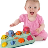 Ta interaktywna pop-up zabawka z solidną turkusową podstawą została zaprojektowana z myślą o małych rączkach. Cztery kolorowe postacie „wyskakują” po naciśnięciu przycisku, przesunięciu suwaka, obróceniu pokrętła lub przechyleniu dźwigni. Dzieci w naturalny sposób trenują chwyt, zręczność i koordynację, jednocześnie odkrywając magię przyczyny i skutku.