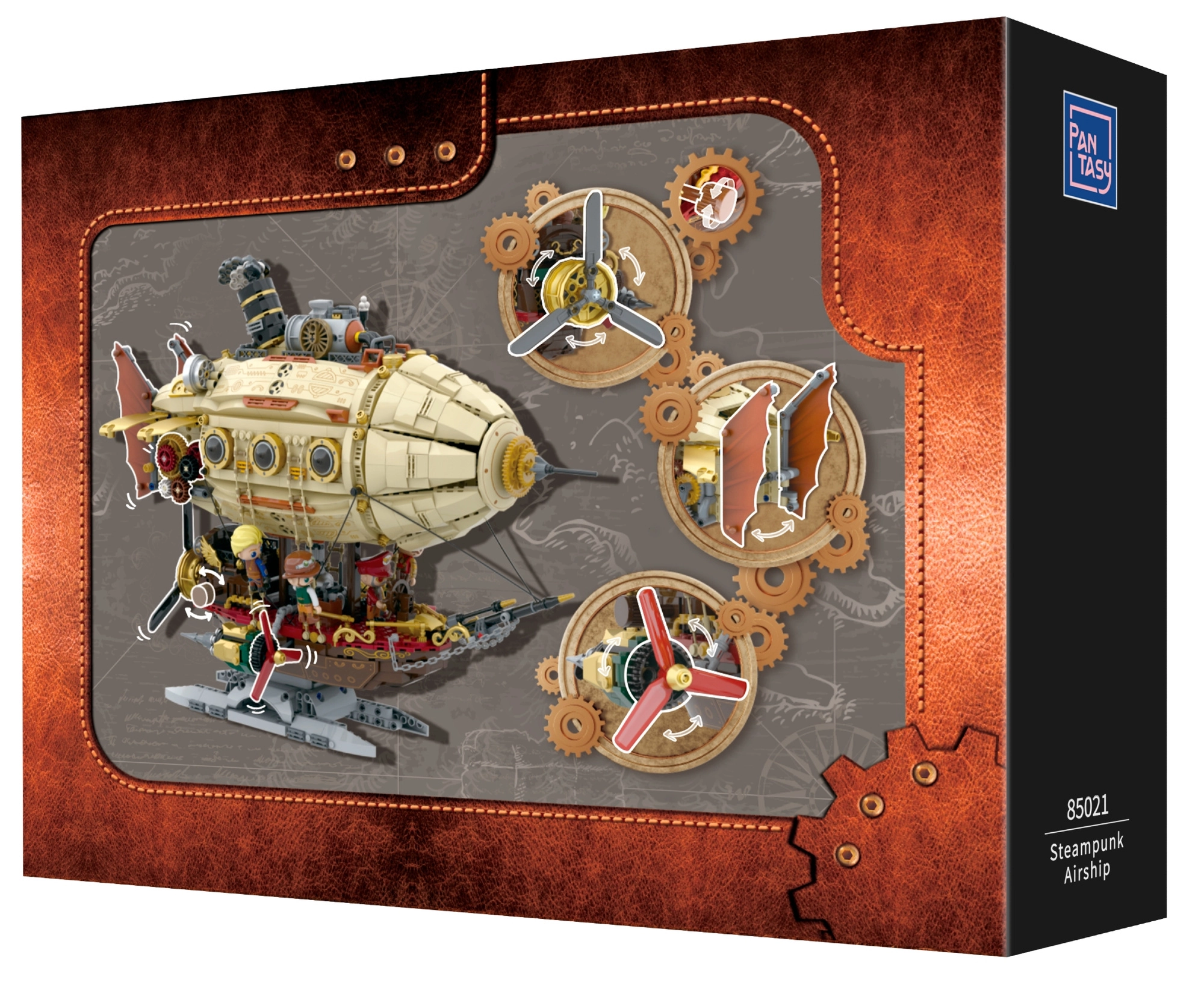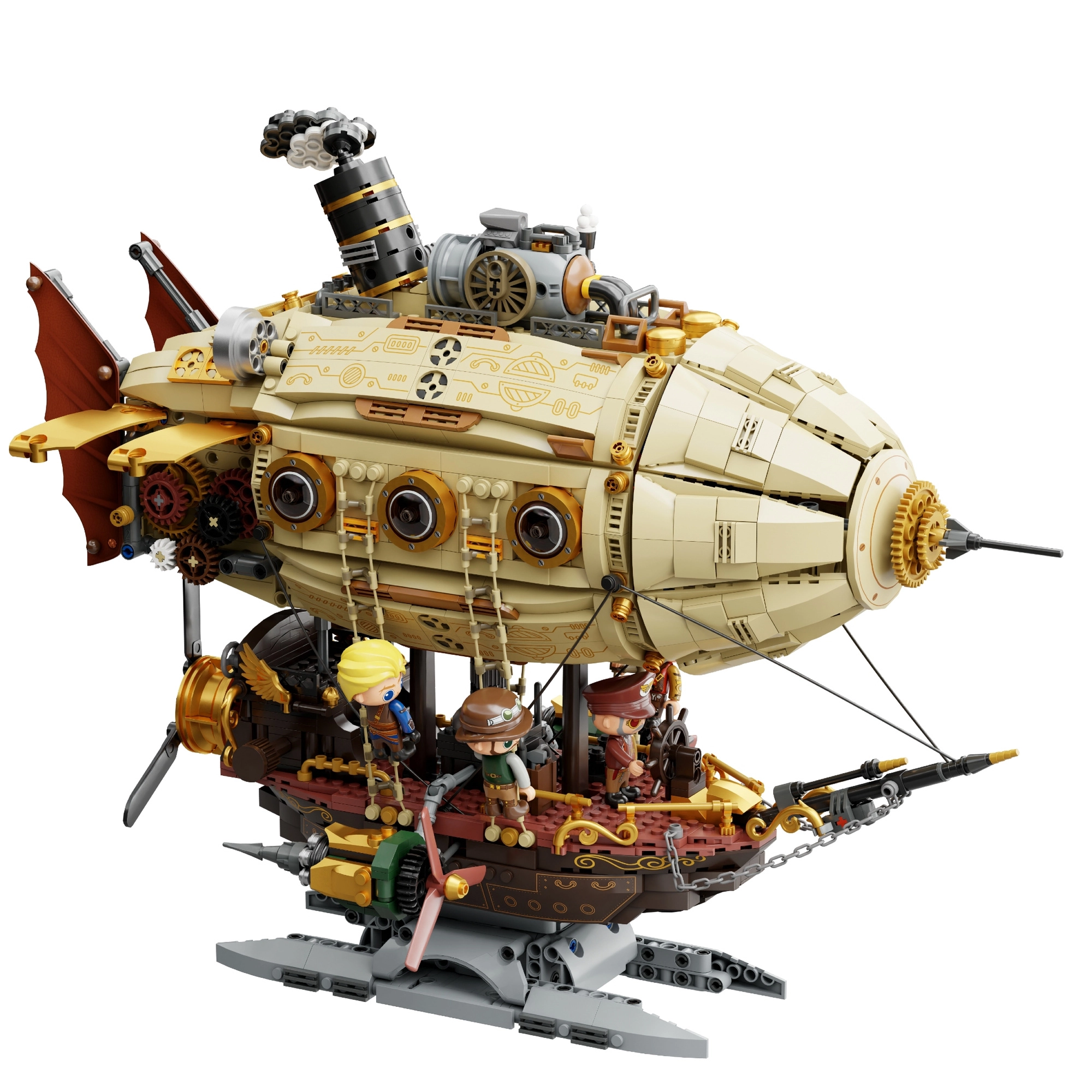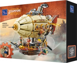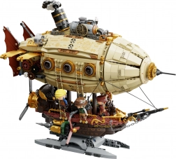 Ten steampunkowy sterowiec łączy elegancką retro estetykę z wyjątkowymi mechanicznymi detalami. Po złożeniu wyróżnia się duży balon, boczne śmigła, olinowanie i koła zębate, które nadają modelowi autentyczny wygląd i świetne możliwości zabawy. Dzięki ruchomym elementom i przemyślanej konstrukcji cieszy zarówno podczas budowania, jak i ekspozycji.