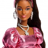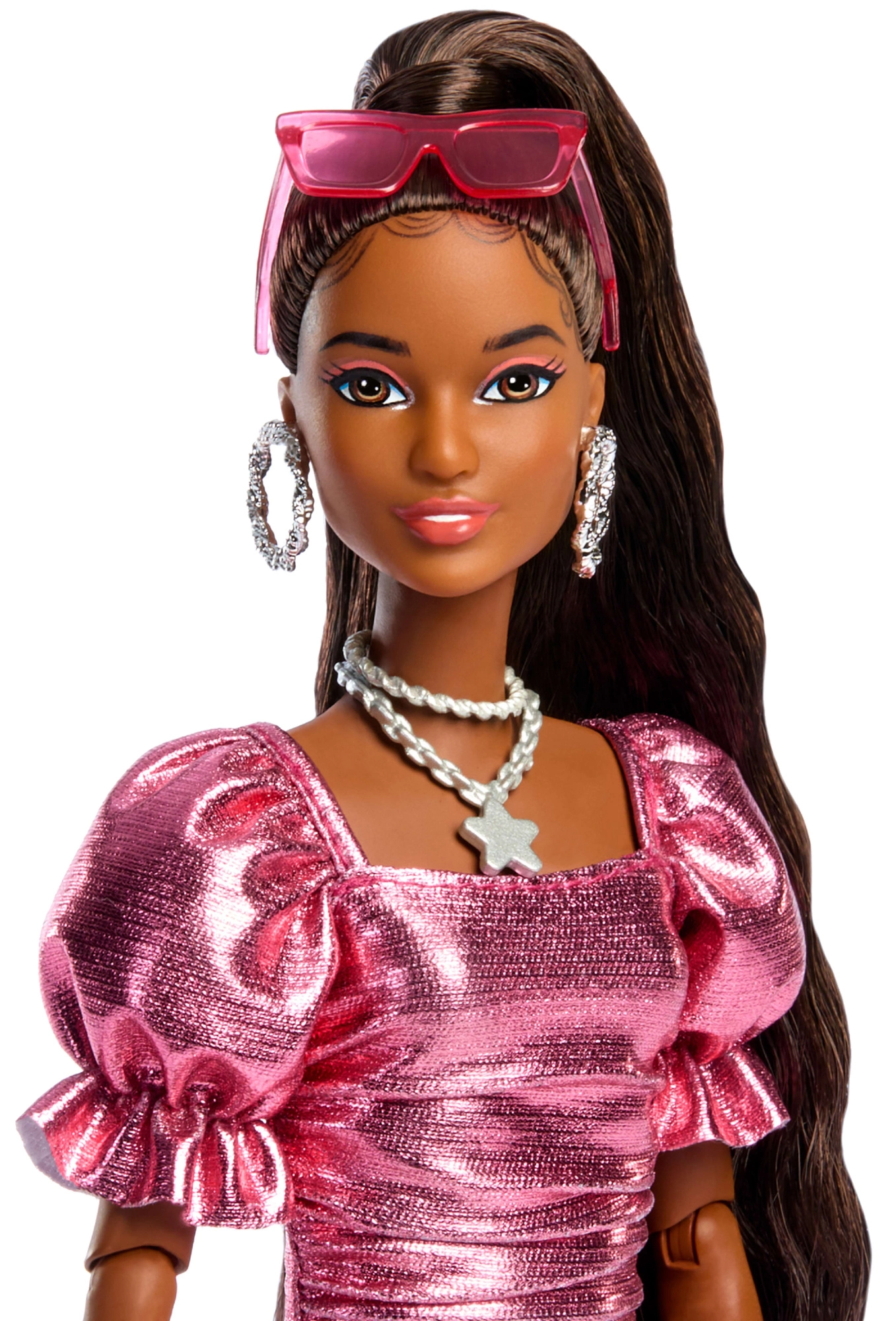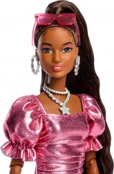 Lalka BARBIE Deluxe Style wyróżnia się nowoczesnym lookiem i wysokiej jakości materiałami. Błyszcząca koralowa suknia z obszerną dolną częścią, różowe okulary, kolczyki-koła, warstwowy naszyjnik i elegancka torebka tworzą doskonały zestaw na wybieg i do codziennych historii. Długie ciemne włosy w wysokim kucyku podkreślają trendowy wygląd.