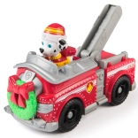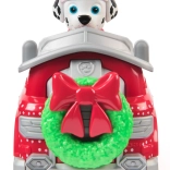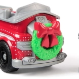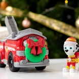 Czerwony wóz strażacki zdobi zielony wieniec z kokardą i zimowe motywy. Marshall w ciepłej czapce przygotuje każdą misję na zimę.