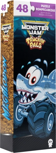 Odkryj zabawę z puzzlami MONSTER JAM Truckin' Pals, które po ułożeniu odsłaniają dynamiczny obraz monster trucka Megalodon przypominającego rekina. Dzięki 48 solidnym elementom puzzle są idealne dla dzieci od 4 lat, które dopiero zaczynają przygodę z układaniem.