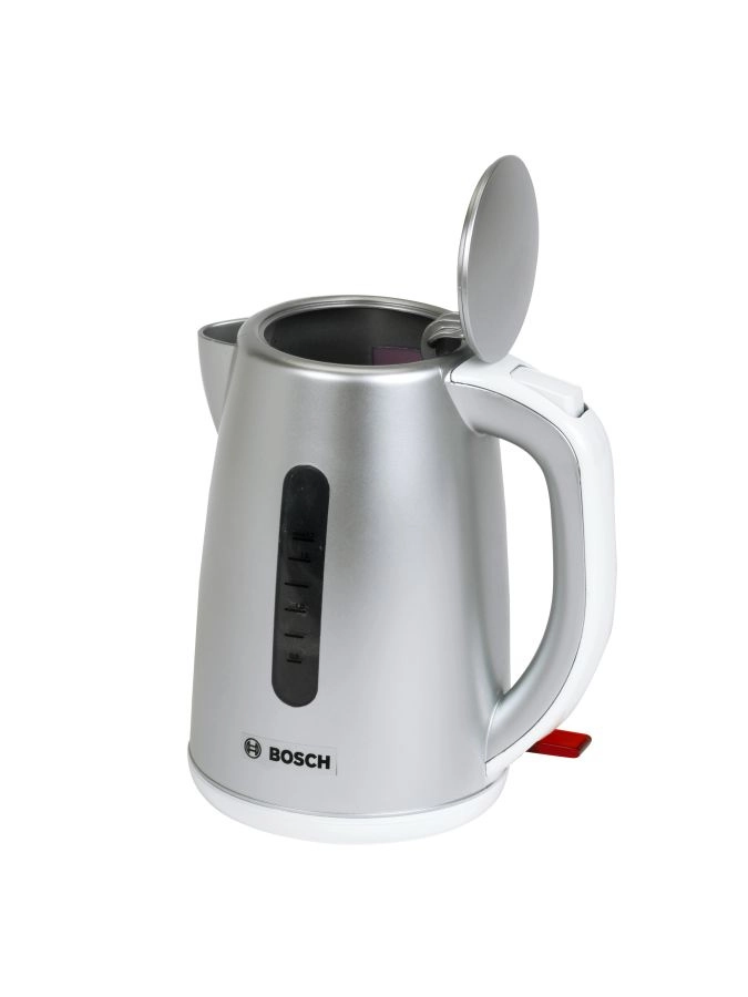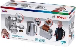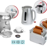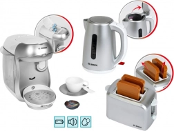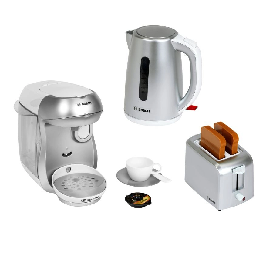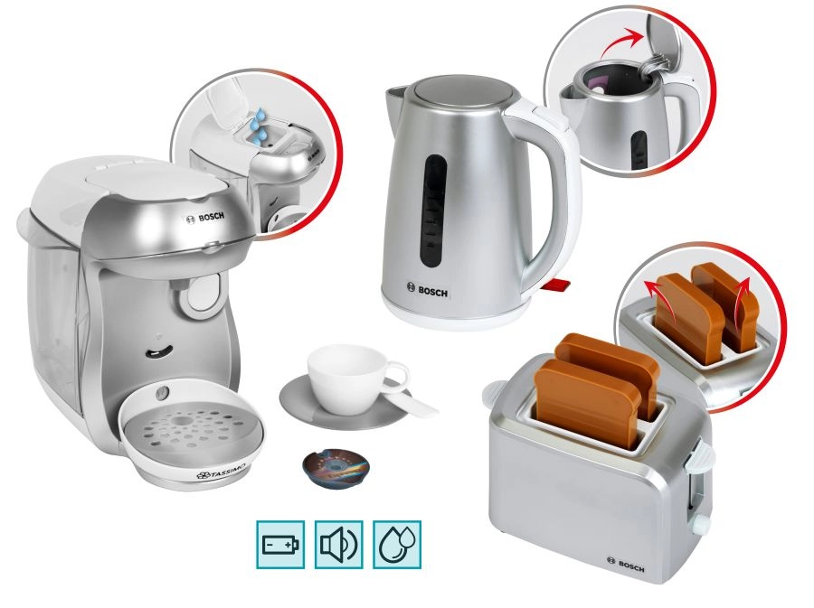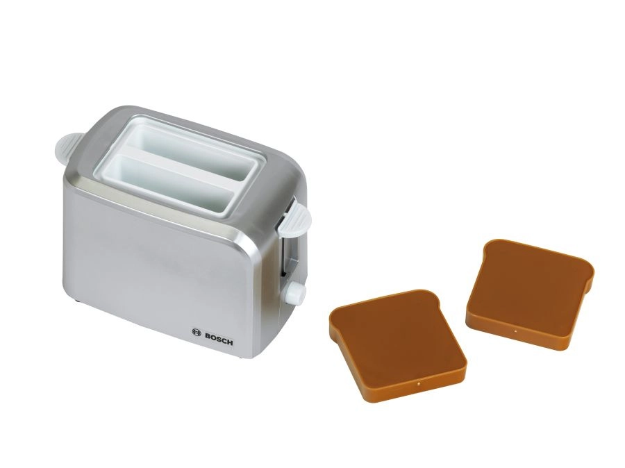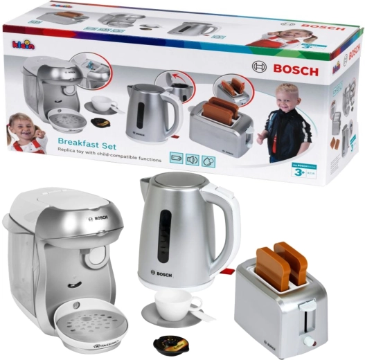 W zestawie jest również kompaktowy toster w szarym kolorze z automatycznym wyskakiwaniem dwóch tostów, mechanizmem podnoszenia i pokrętłem z imitacją regulacji. Zestaw uzupełnia dziecięcy czajnik elektryczny z otwieraną pokrywką i przełącznikiem dla jeszcze bardziej realistycznej zabawy.