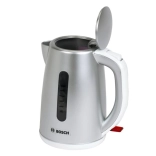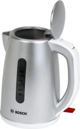 Dziecięcy czajnik w metalicznie szarym wzornictwie ma ergonomiczny uchwyt, okienko poziomu oraz łatwo otwieraną pokrywkę, co ułatwia dolewanie wody podczas zabawy.