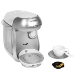 Dziecięcy ekspres w eleganckim, szarym kolorze oferuje prawdziwy przepływ wody bez podgrzewania – wystarczy napełnić zbiornik ze skalą i nacisnąć przycisk. Do tego otwierana klapka na kapsułkę, zdejmowana podstawka pod filiżankę oraz biała filiżanka ze spodkiem dla autentycznego rytuału kawowego.