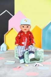 Stylowy strój dla lalek BABY born o wielkości 36 cm z motocyklowym charakterem: czerwona kurtka w skórzanym wyglądzie z nadrukiem misia, szaro-niebieskie spodnie, niebieskie trampki oraz czapka z daszkiem z kaczuszką Bertą. Krój easy fit ułatwia przebieranie, w zestawie znajduje się wieszak.